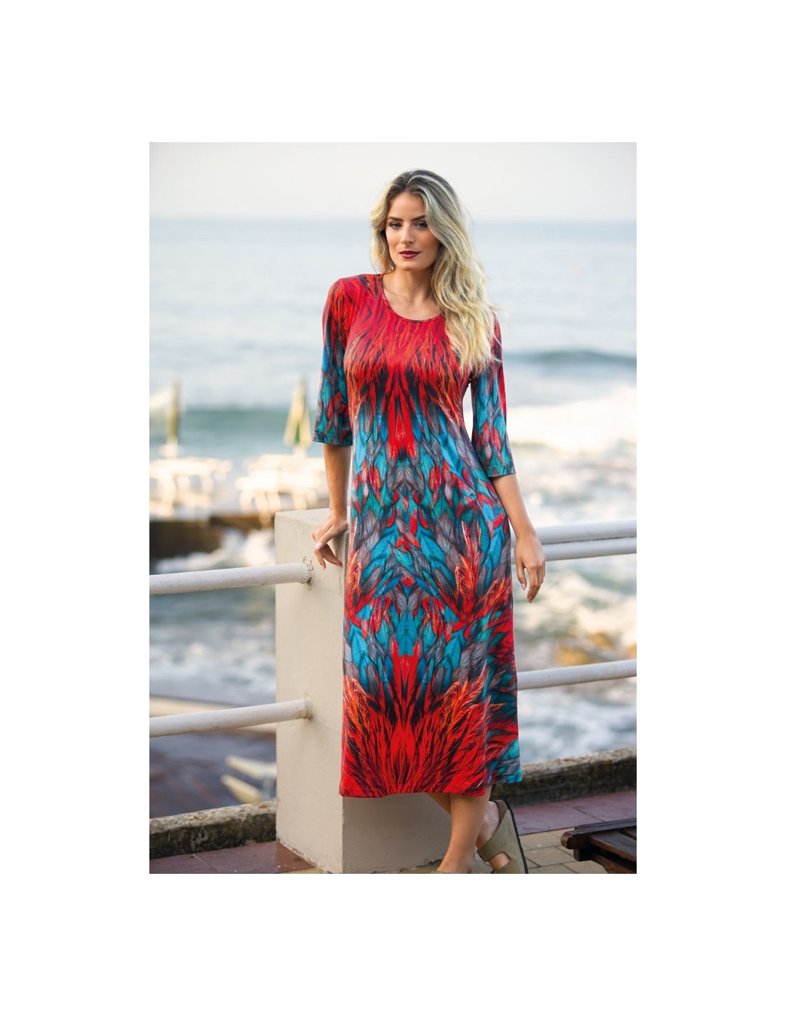 Questo abito lungo è un'esplosione di colore e dinamismo, perfetto per chi cerca un look d'impatto che non rinunci alla praticità. Il tessuto garantisce una caduta fluida e una vestibilità che accarezza le forme senza costringerle, mantenendo una piacevole sensazione di freschezza anche con temperature elevate.