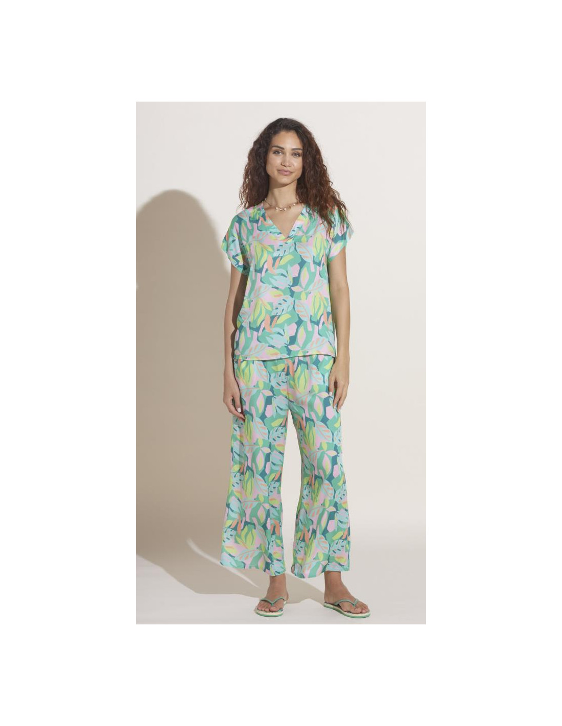 COMPLETO MARE DONNA SCOLLO A V MANICA CORTA E PANTALONE LUNGO IN VISCOSA
