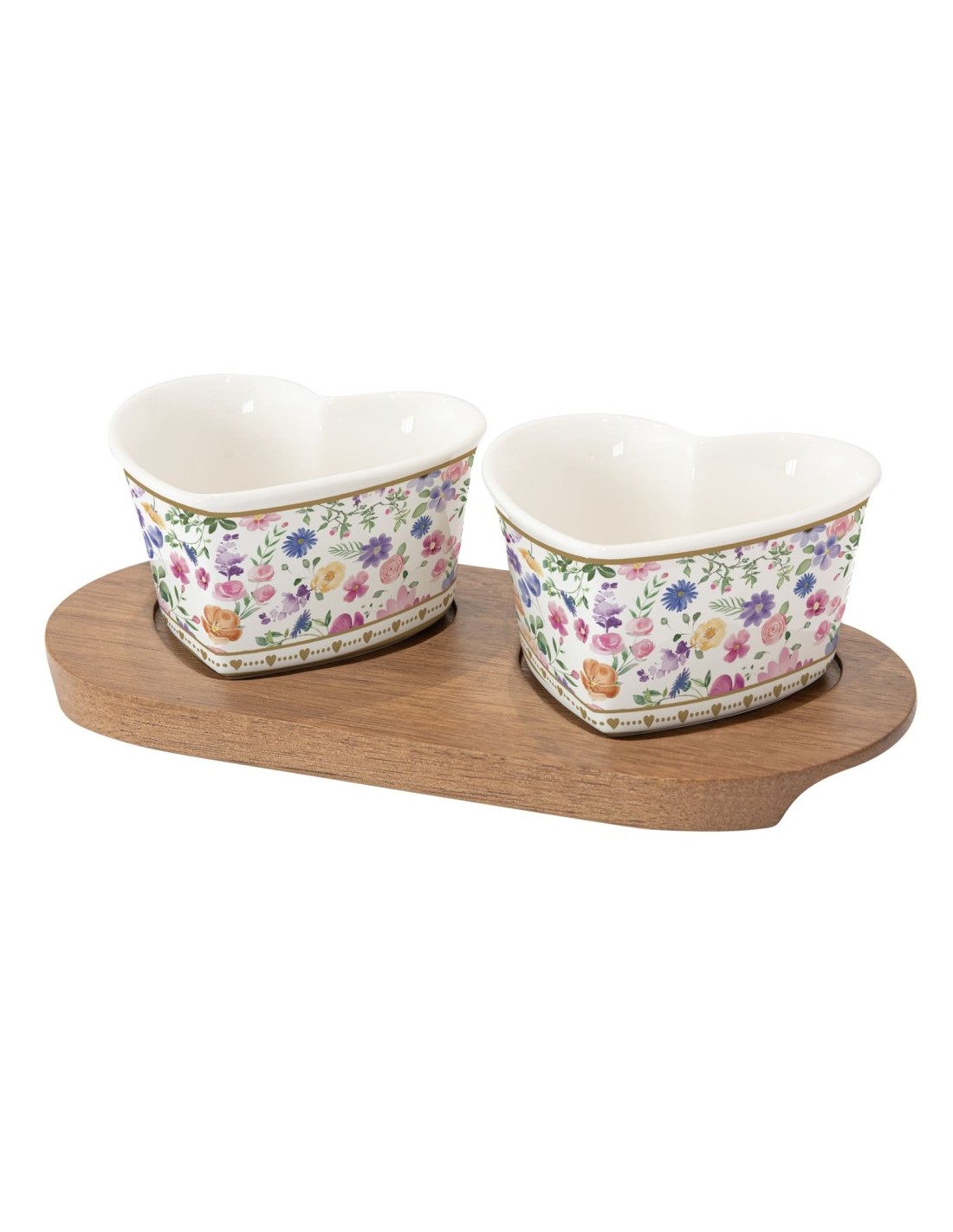 Set aperitivo 2 ciotole a foma di cuore in porcellana su vassoio in legno