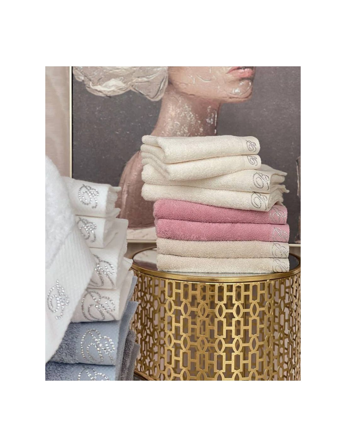 L'eleganza senza tempo del marchio Blumarine è impreziosita da un tocco di brillantezza grazie al logo in cristalli Swarovski, che si distingue con maestria su ogni asciugamano.