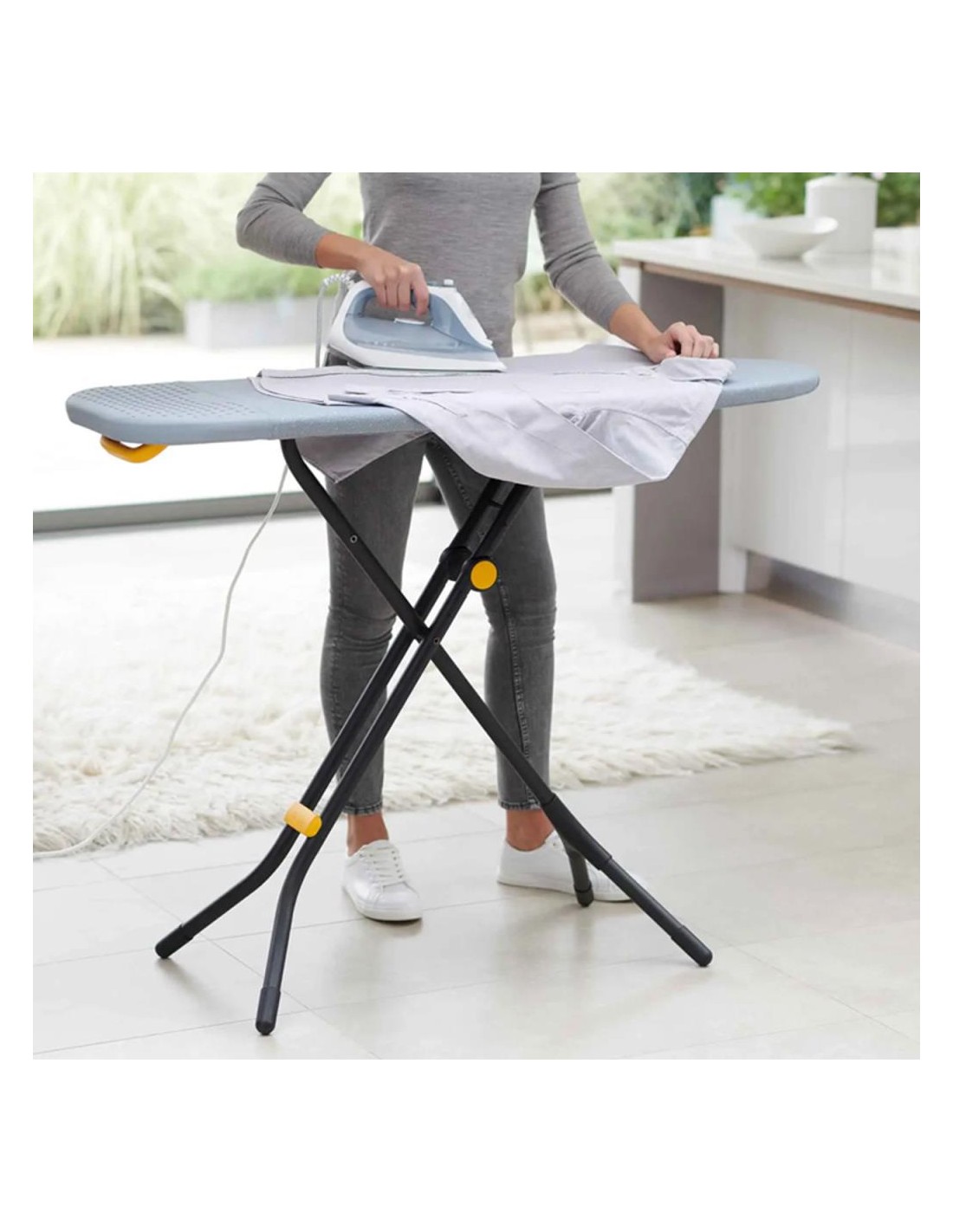 Questo rivoluzionario asse da stiro a grandezza naturale presenta un design unico del supporto che lo rende più compatto quando riposto rispetto ad altri assi da stiro convenzionali.