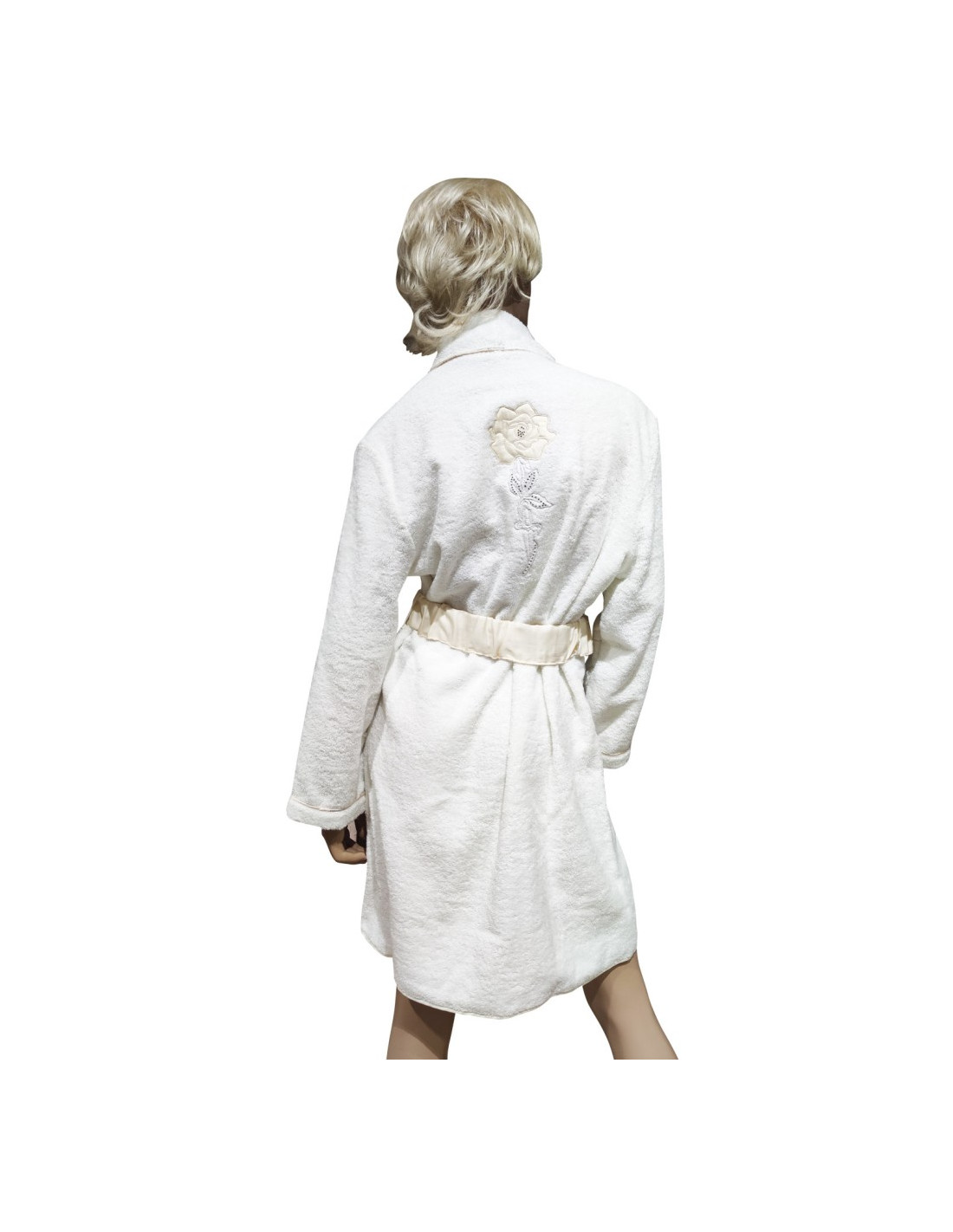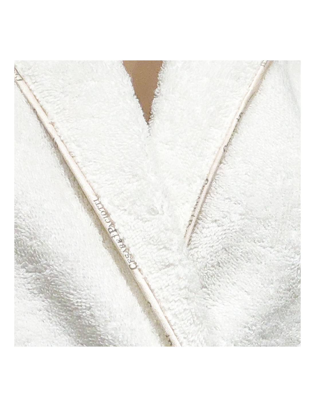 - 1 Accappatoio corto sciallato, rifinito con profilo logato e retro con logo e applicazione ricamata;