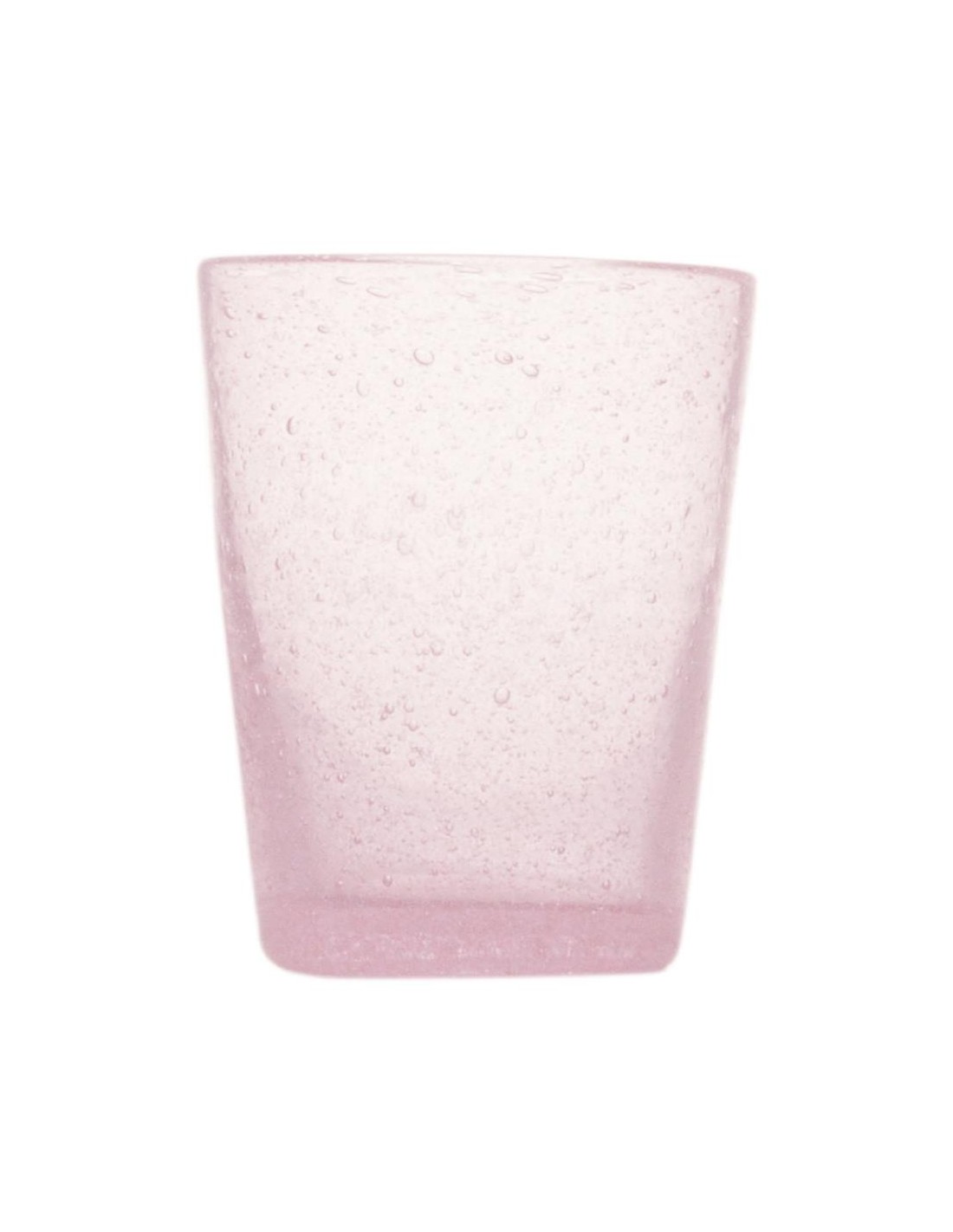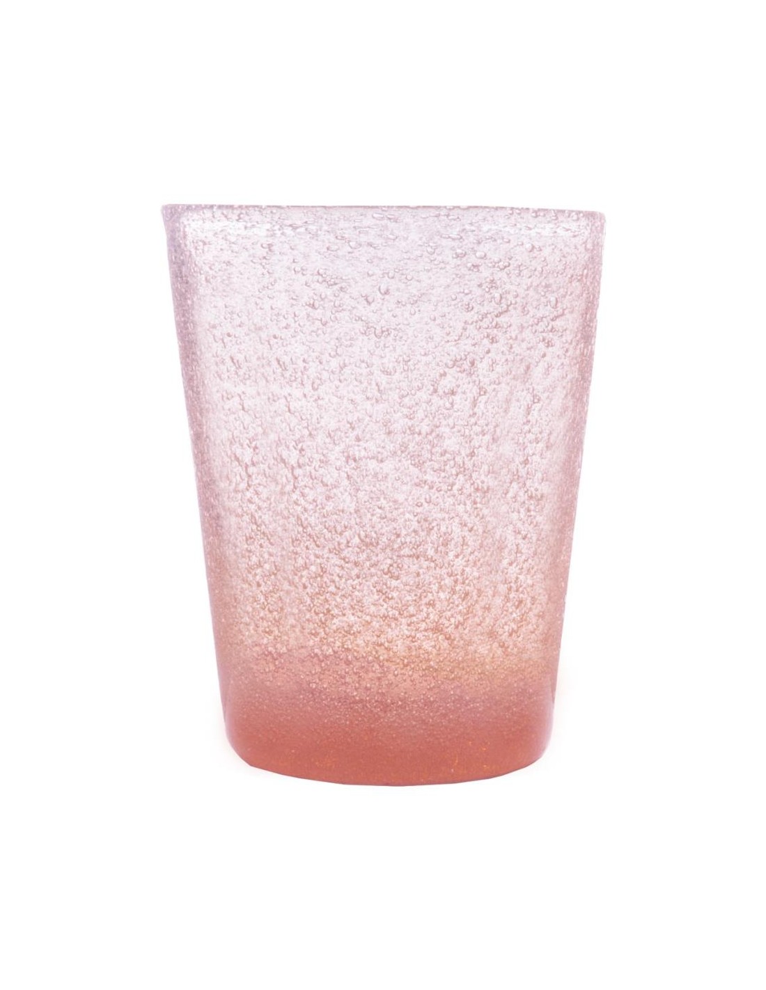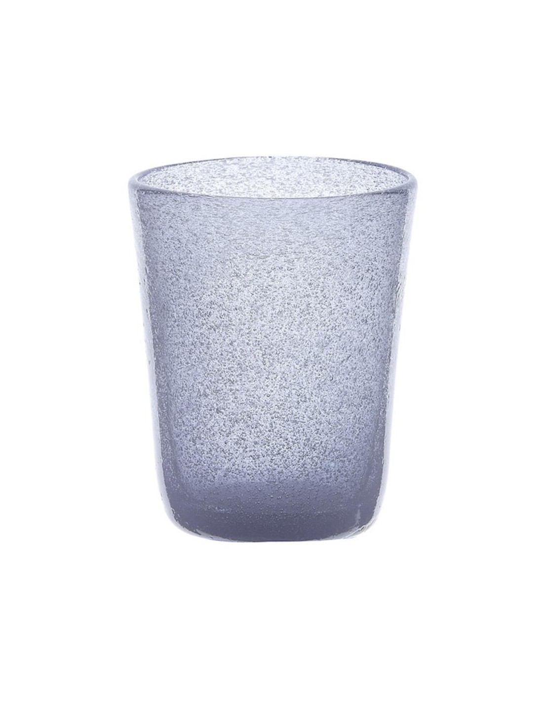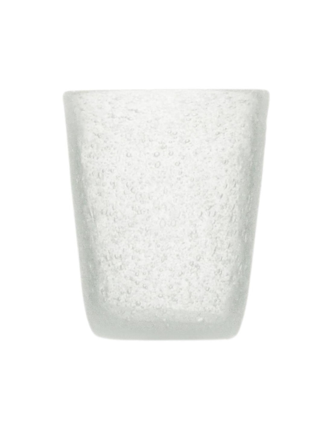 Vetro soffiato a bocca e lavorato a mano dando una caratteristica unica ad ogni singolo pezzo, abbellito da bollicine all'interno del vetro.