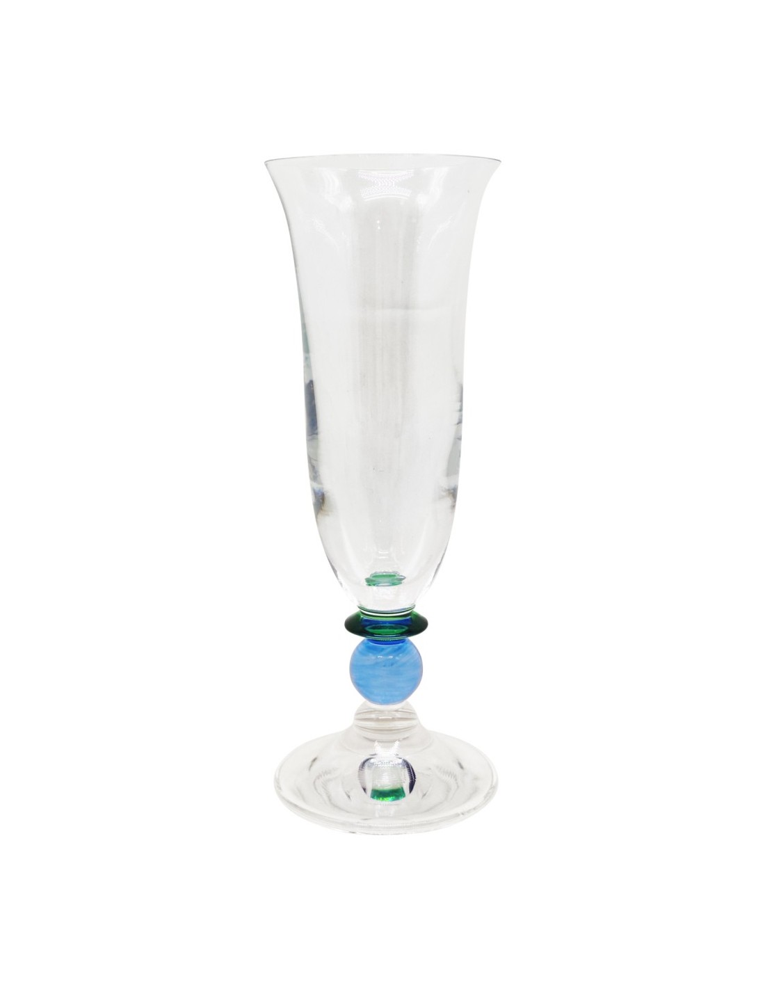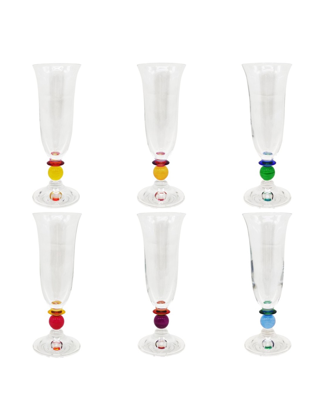 Set composto da 6 calici da Flut in vetro trasparente, con steli realizzati in diverse tonalità, ciascun pezzo con gambo di colore differente.