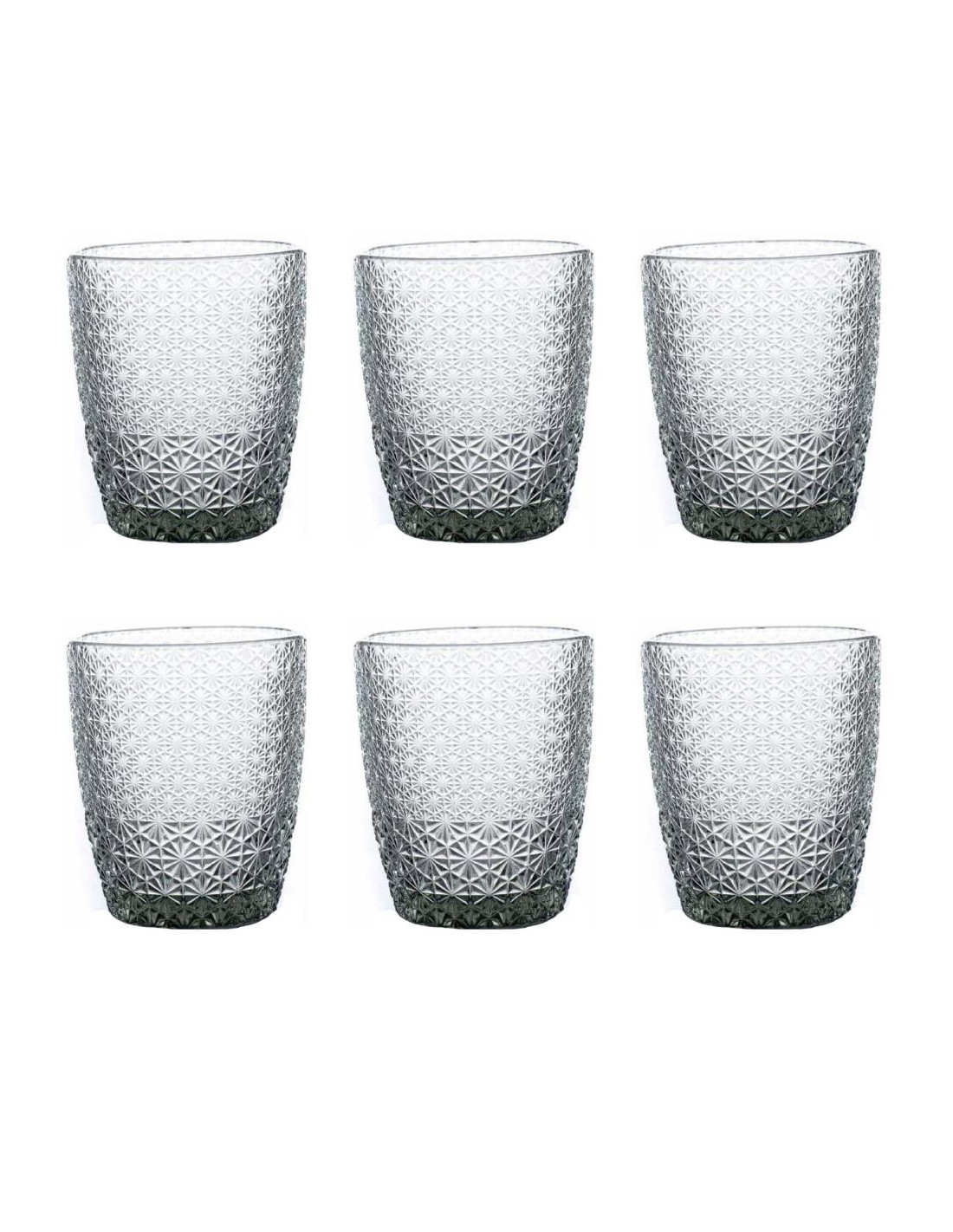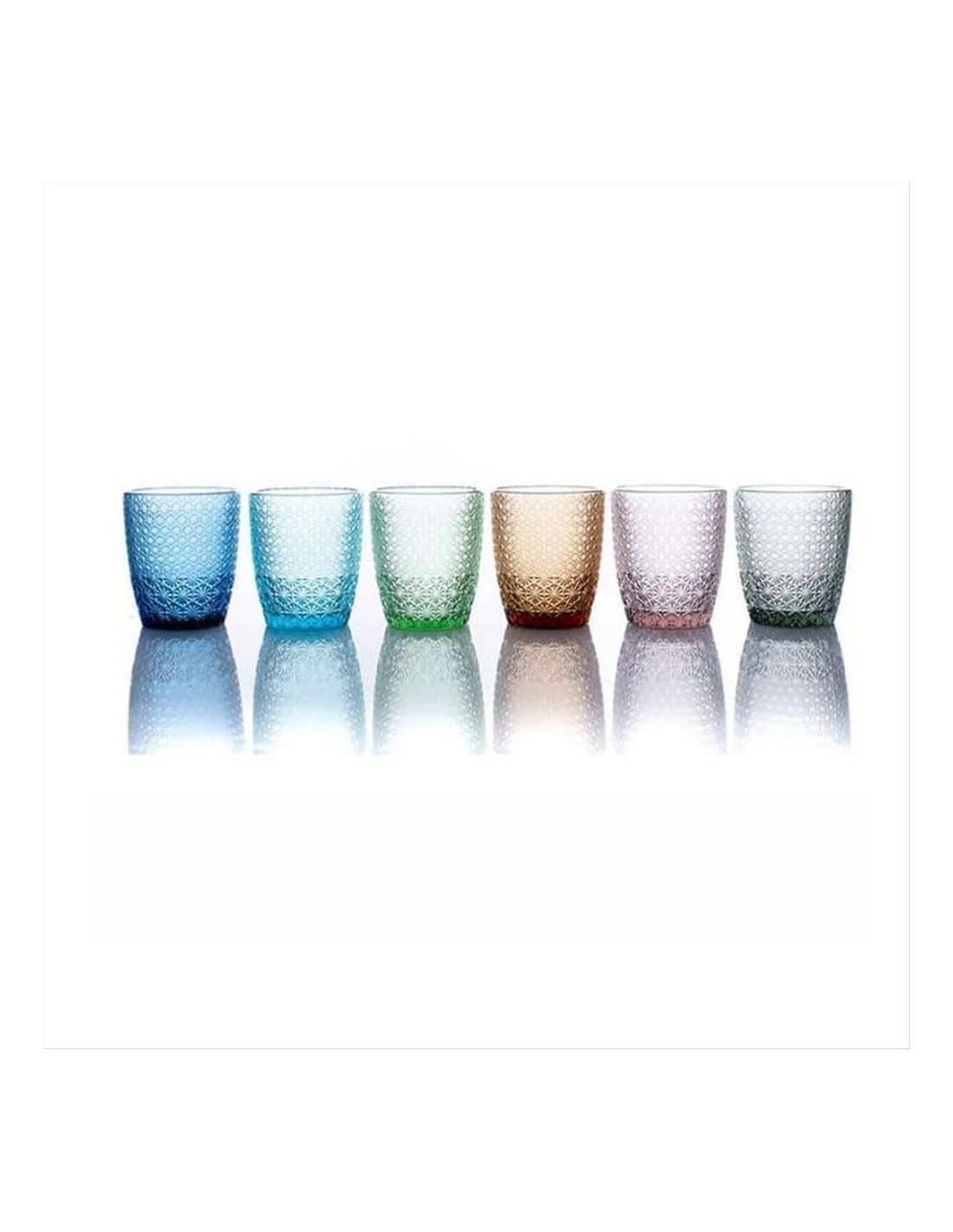 Set di 6 bicchieri da acqua, in pasta di vetro con motivo geometrico optical a rilievo, bellissimi, spiritosi ed eleganti allo stesso tempo, per una tavola originale.