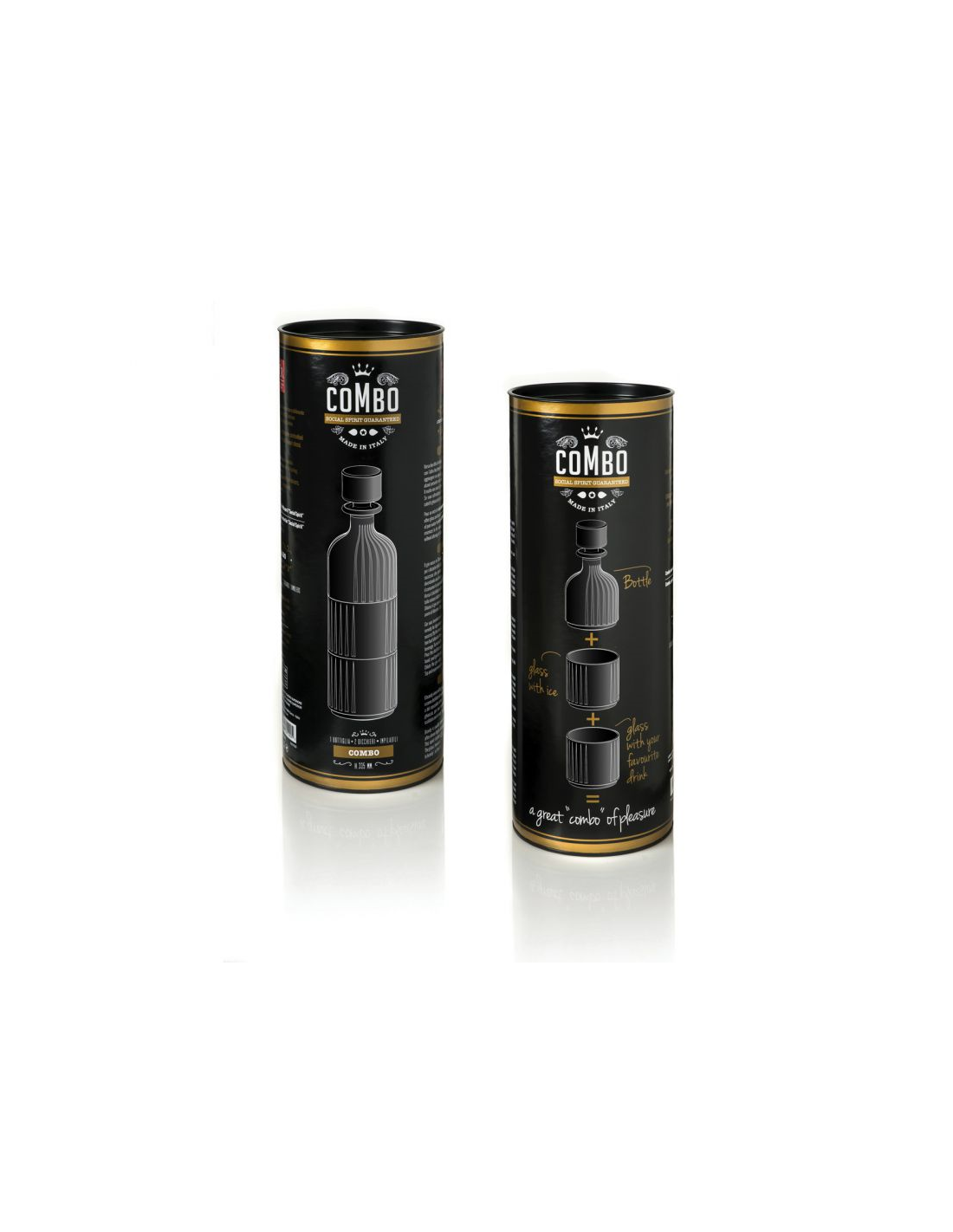 Il set regalo Combo e' composto da una bottiglia RCR e due pregiati bicchieri RCR che si impilano comodamente componendo cosi' il set bottiglia Combo alto 33,5cm.