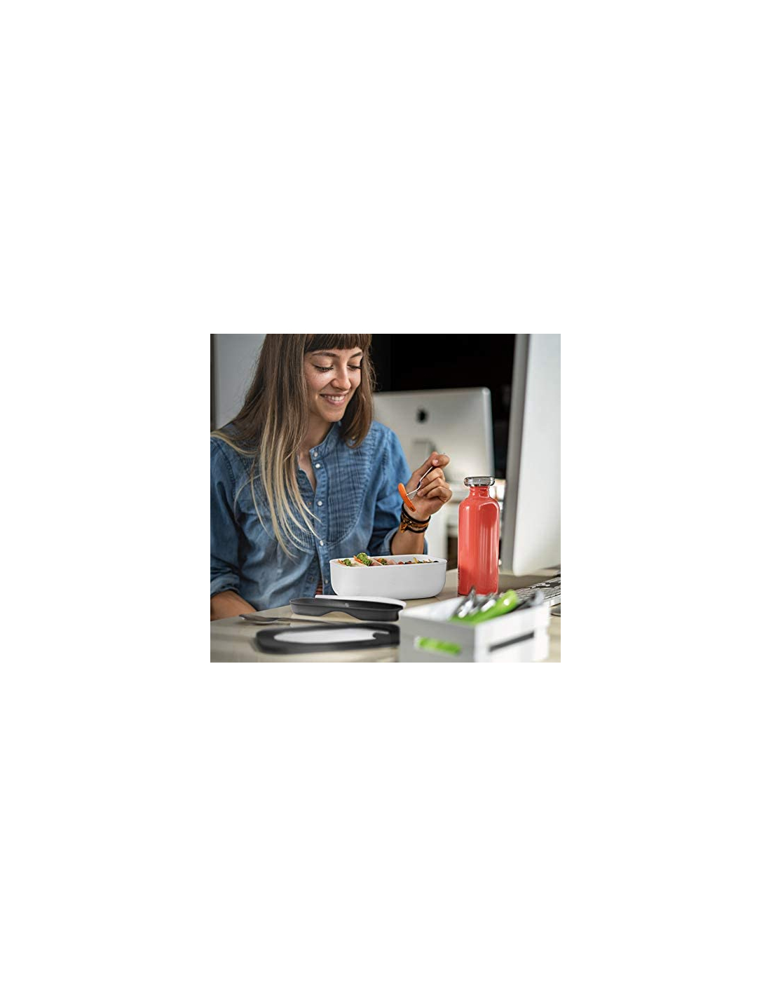 Il set è composto dalla lunch box Store&Go che ha all'interno due contenitori rettangolari, uno dentro l'altro, che possono contenere fino a 900 ml e che permettono di dividere diverse tipologie di cibo evitando la contaminazione dei sapori grazie alla presenza di un comodo coperchio. La lunch box può essere conservata in frigorifero, nel freezer e può essere utilizzata per scaldare le vivande nel microonde con il coperchio ermetico inserito grazie all'innovativa valvola e si può comodamente trasportare in borsa grazie alla tenuta stagna del coperchio-sigillo.