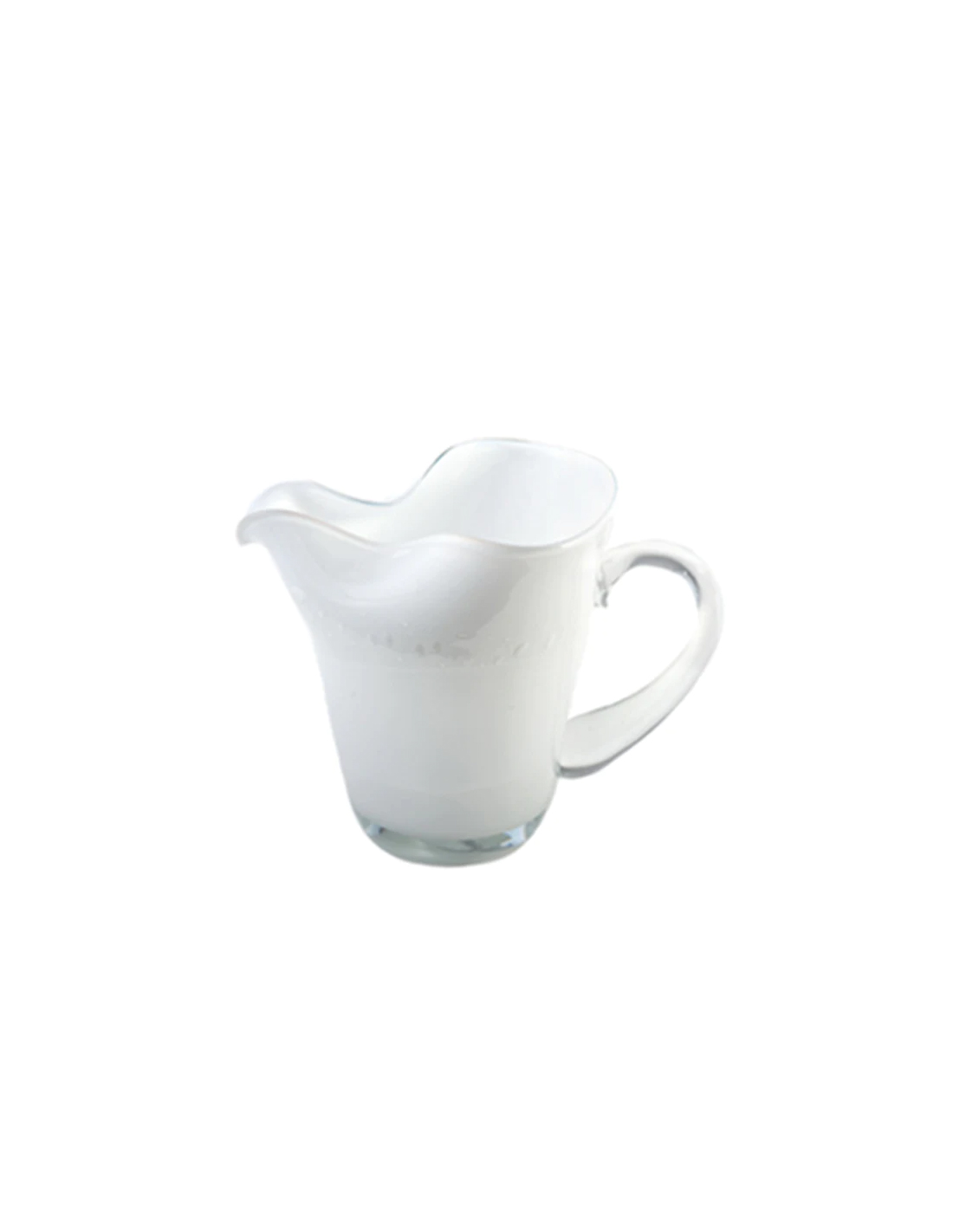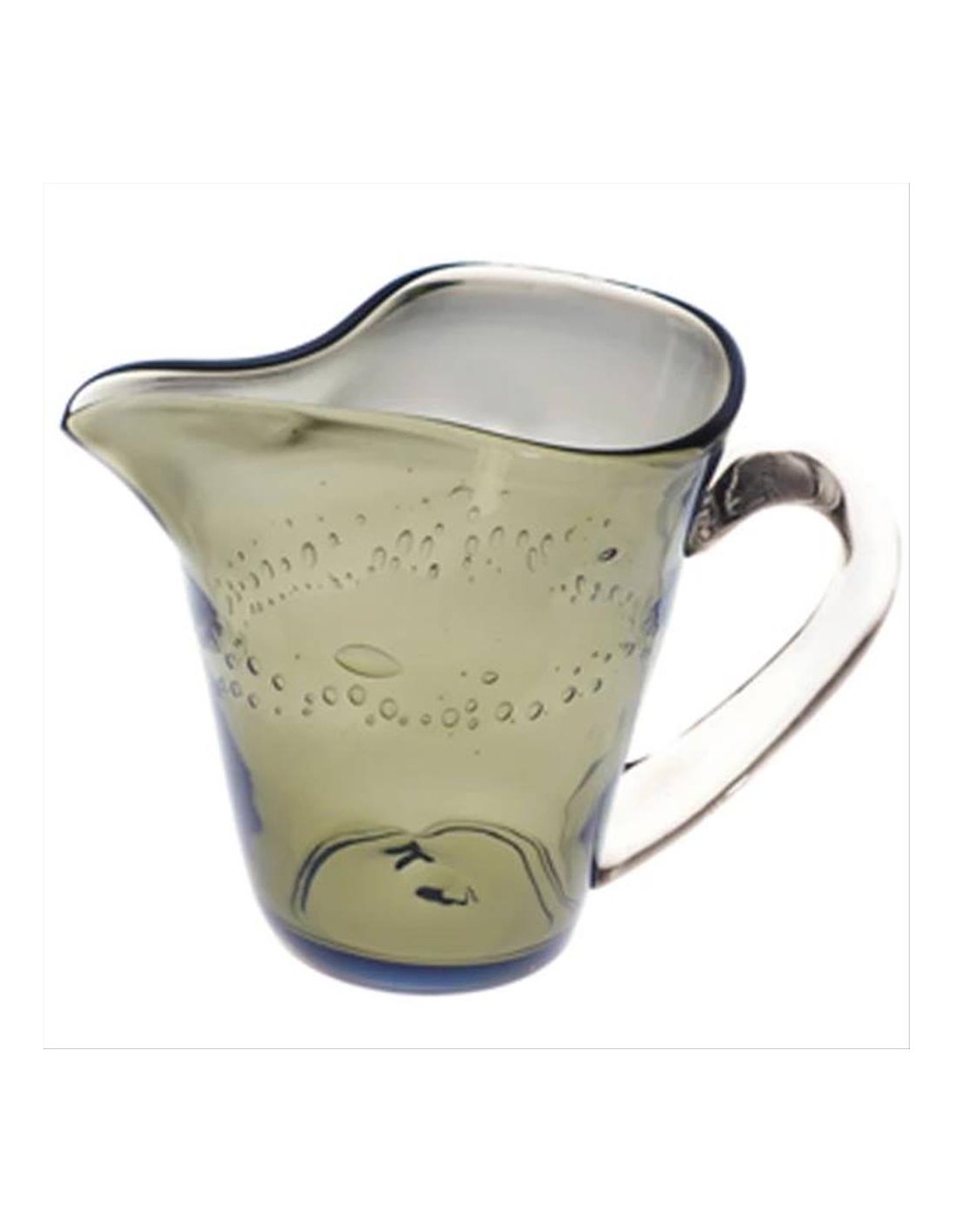 Brocca in vetro temperato trasparente con forma irregolare e bolle al suo interno, elegante e particolare per colorare e rendere originali le tavole , la sua particolarità è nel essere artigianale e quindi diverso in ogni suo pezzo.