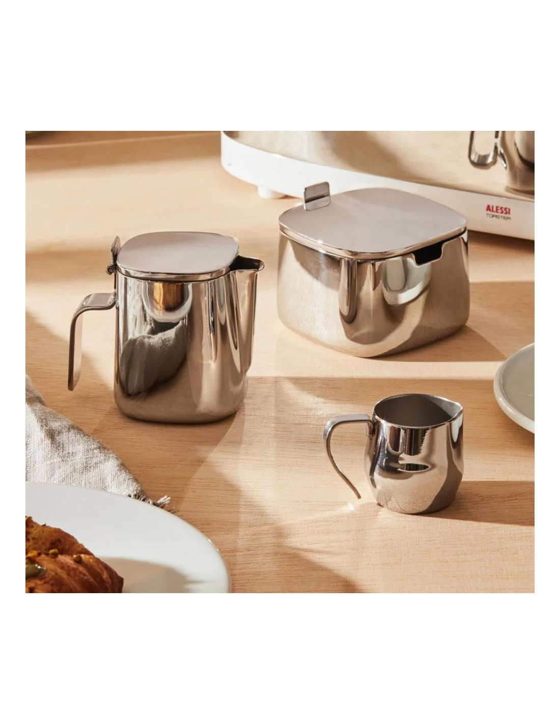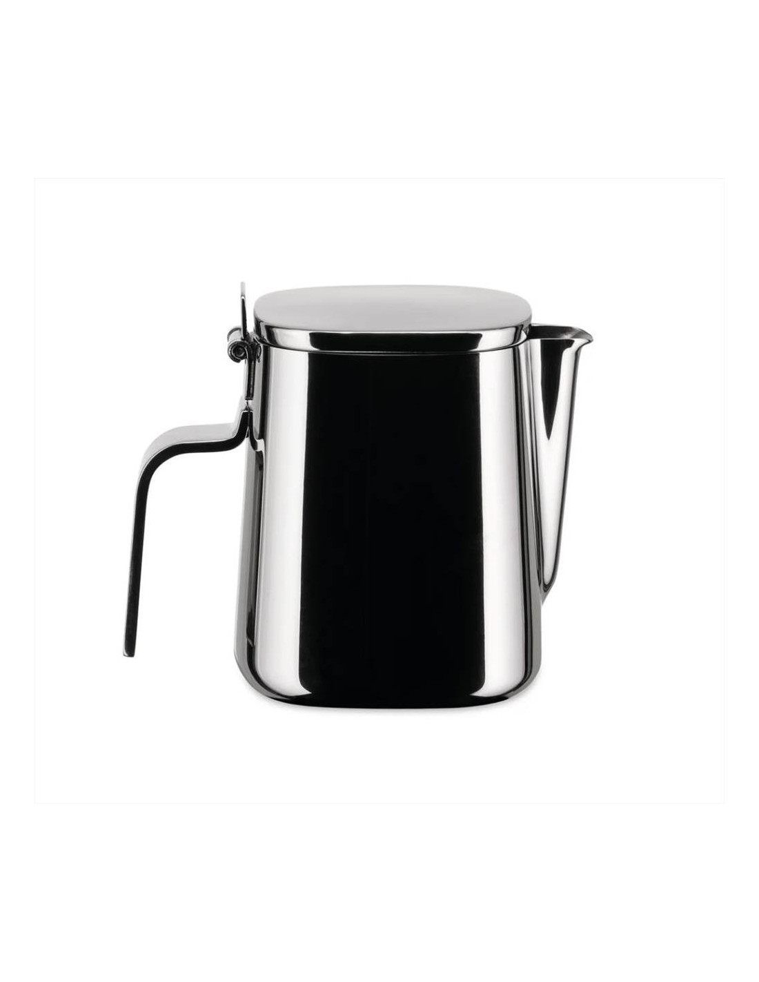 Impilabilità, apertura del coperchio a 180°, becco che taglia la goccia, manico ergonomico, coperchio rientrante nel collo in modo che l’acqua di condensazione non cada sulla tavola.