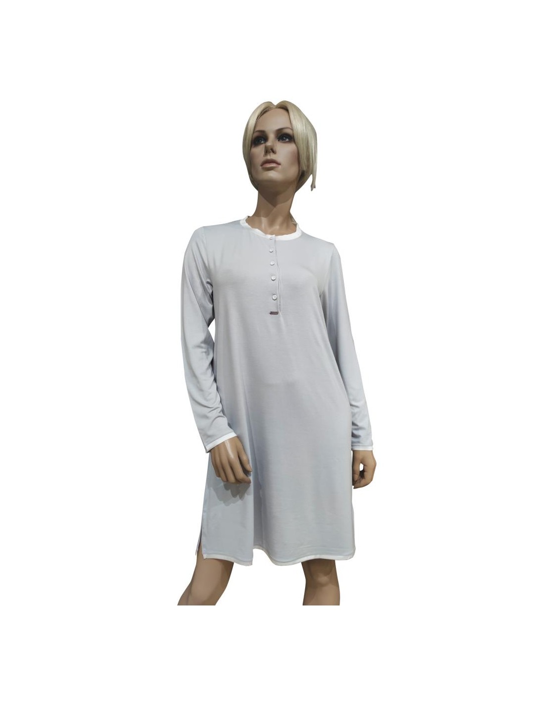collo a serafino 5 bottoni e maniche lunghe.