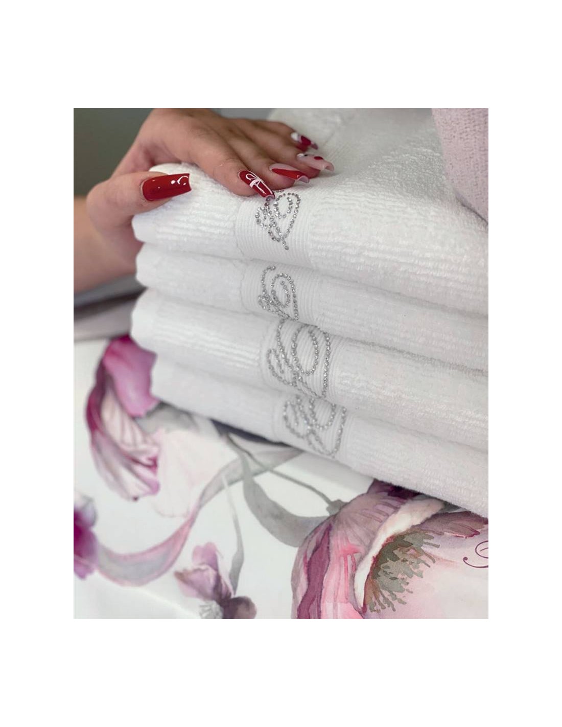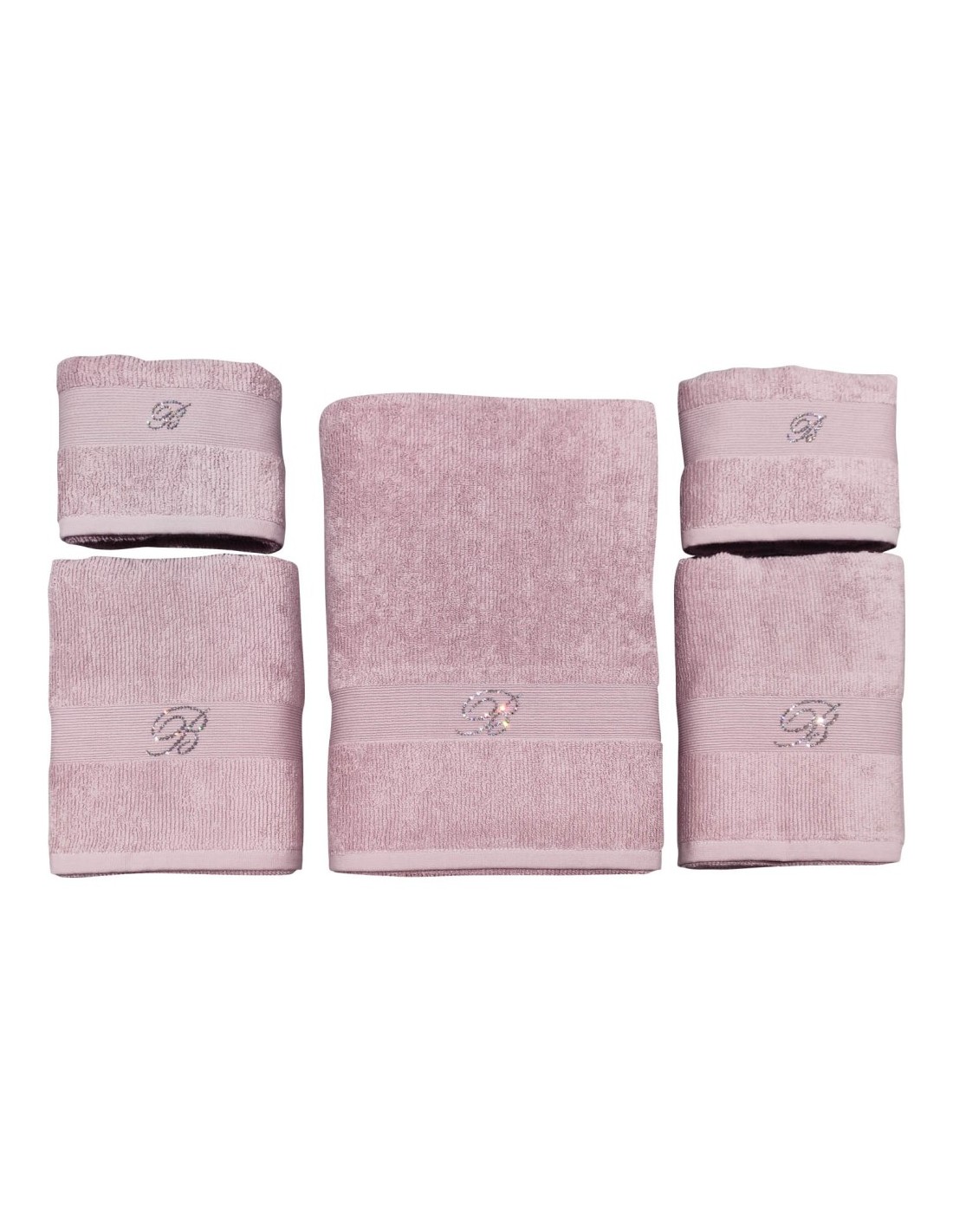 Completo bagno 5 pezzi in spugna tinta unita in jacquard con trama a righe sottili e bordo strabattuto. Logo in cristalli.