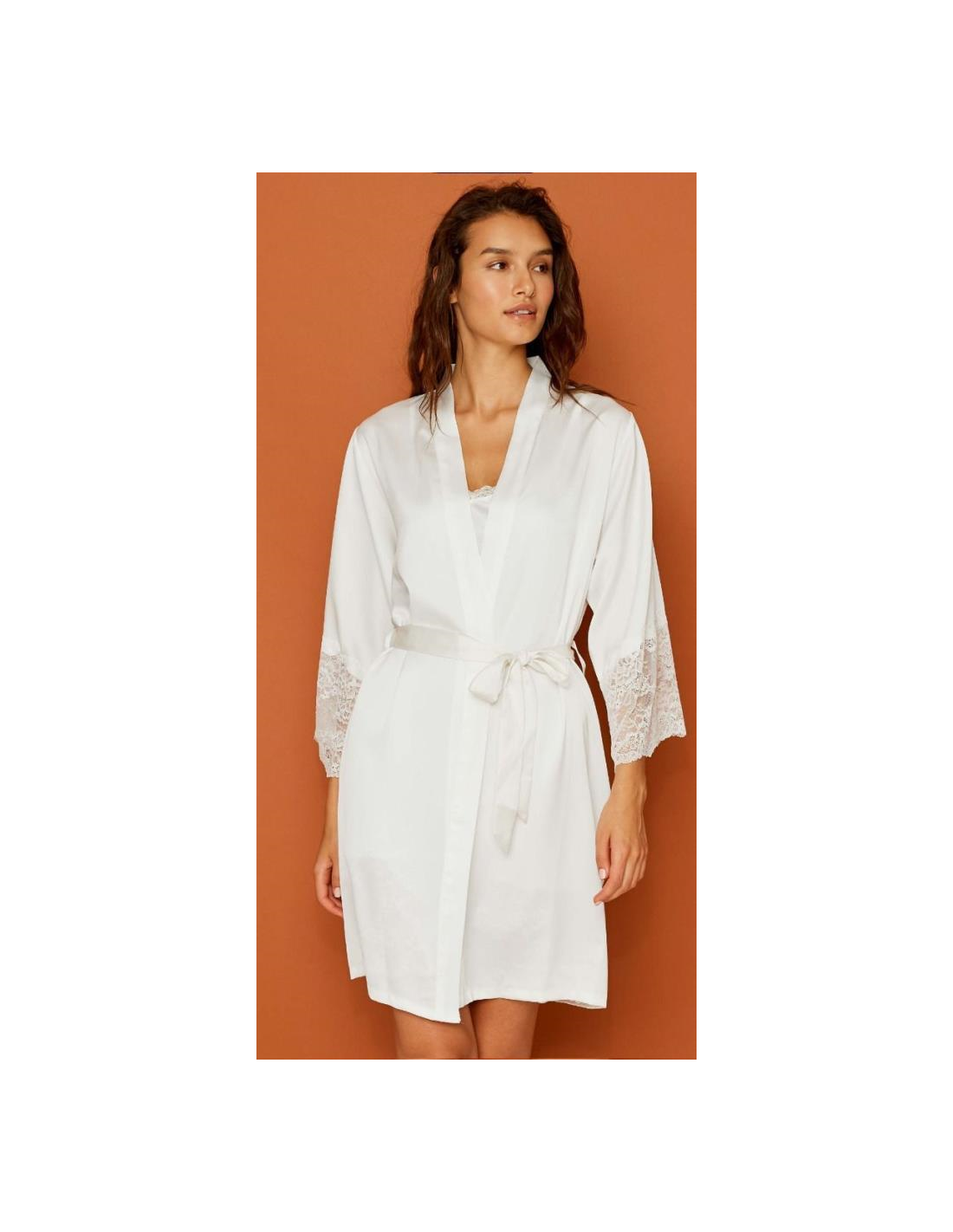 Completo lingerie parure sposa, vestaglia kimono e sottoveste in raso rifinite con pizzo.