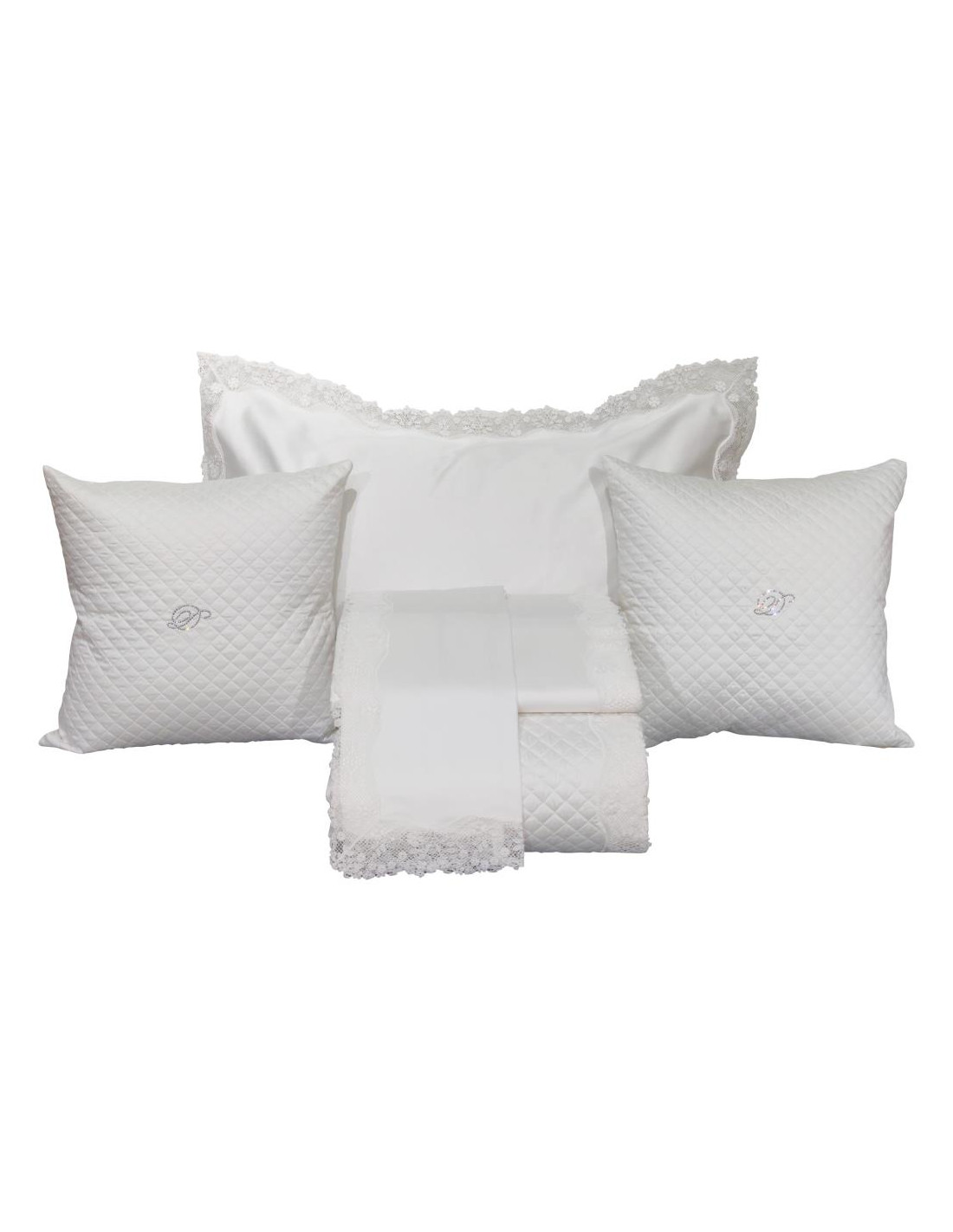 Coordinato letto matrimoniale in rasi di cotone rifinito con pizzo macramè.