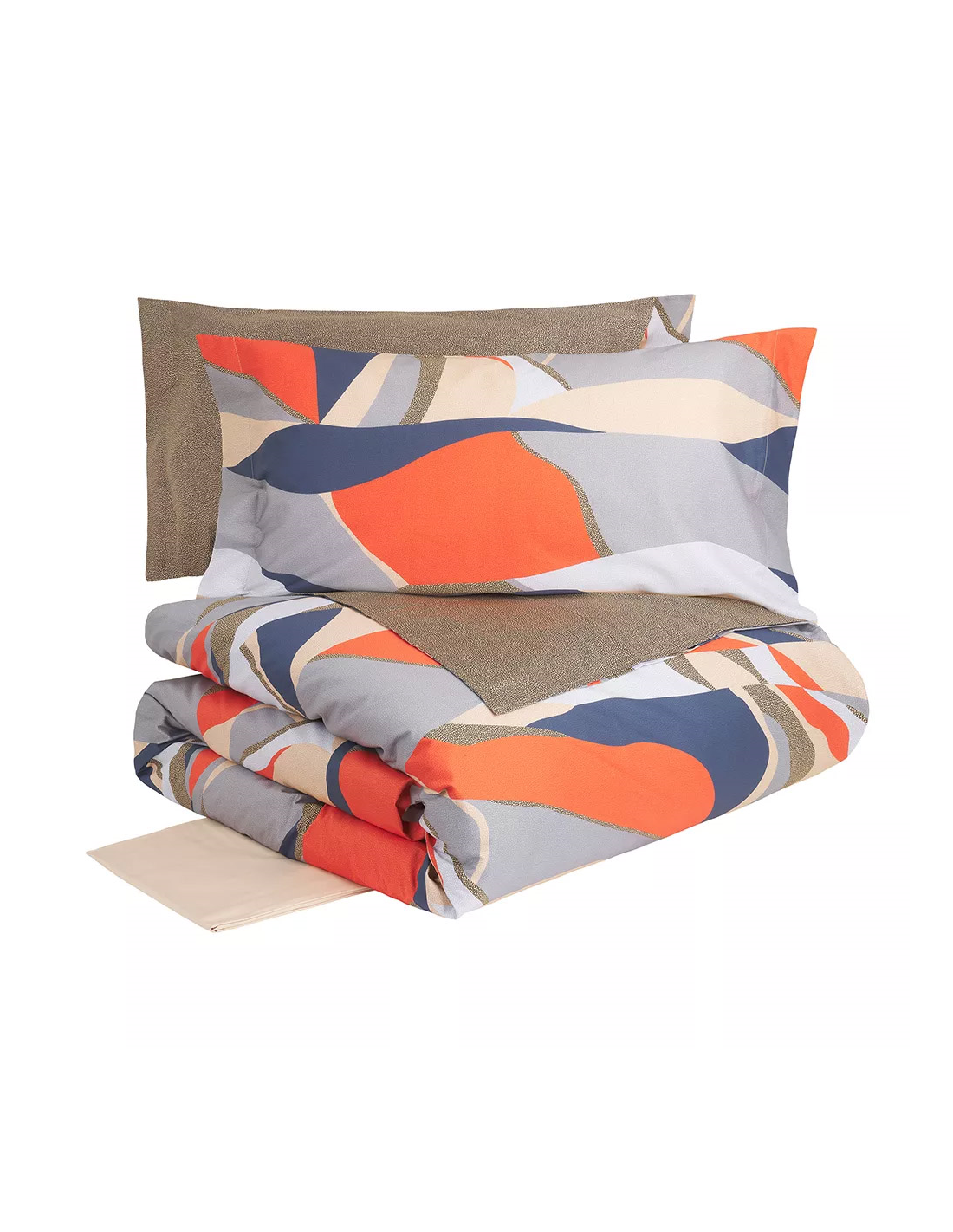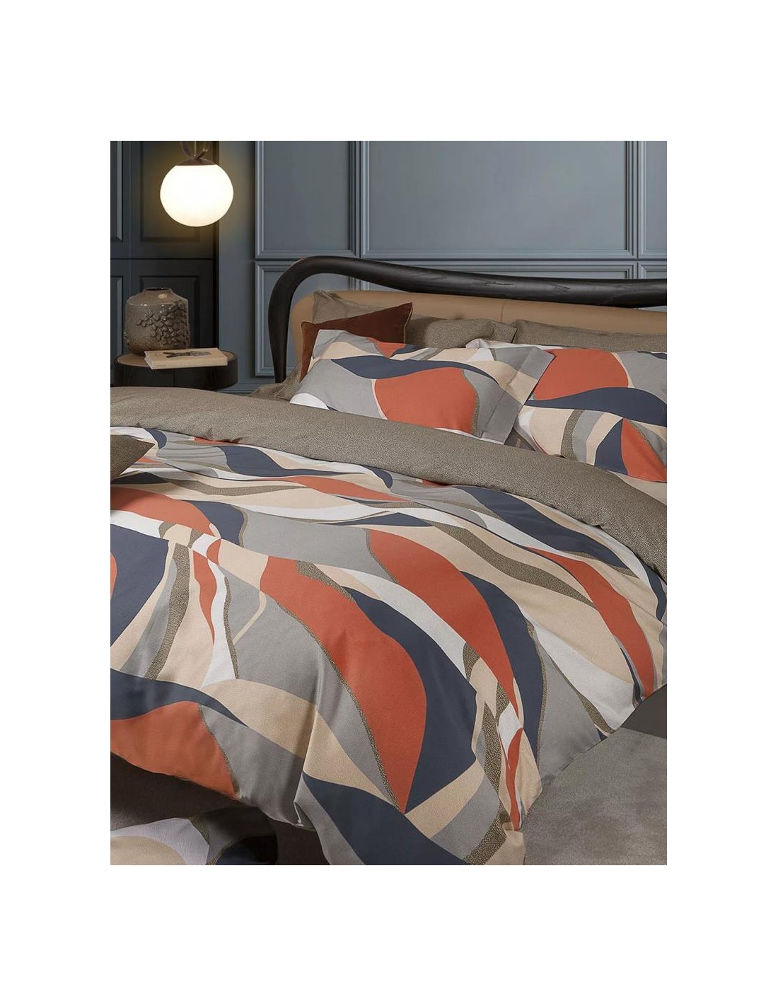 Completo copripiumino double-face realizzato in raso di puro cotone 300 T.C. La parte superiore della sacca copripiumino e delle federe a 2 volant sono stampate in digitale con motivo Wave; la parte inferiore della sacca e delle federe sono stampate in digitale con motivo “OP' Occhio di Pernice; il lenzuolo con angoli è in tinta unita. Confezionato in busta.