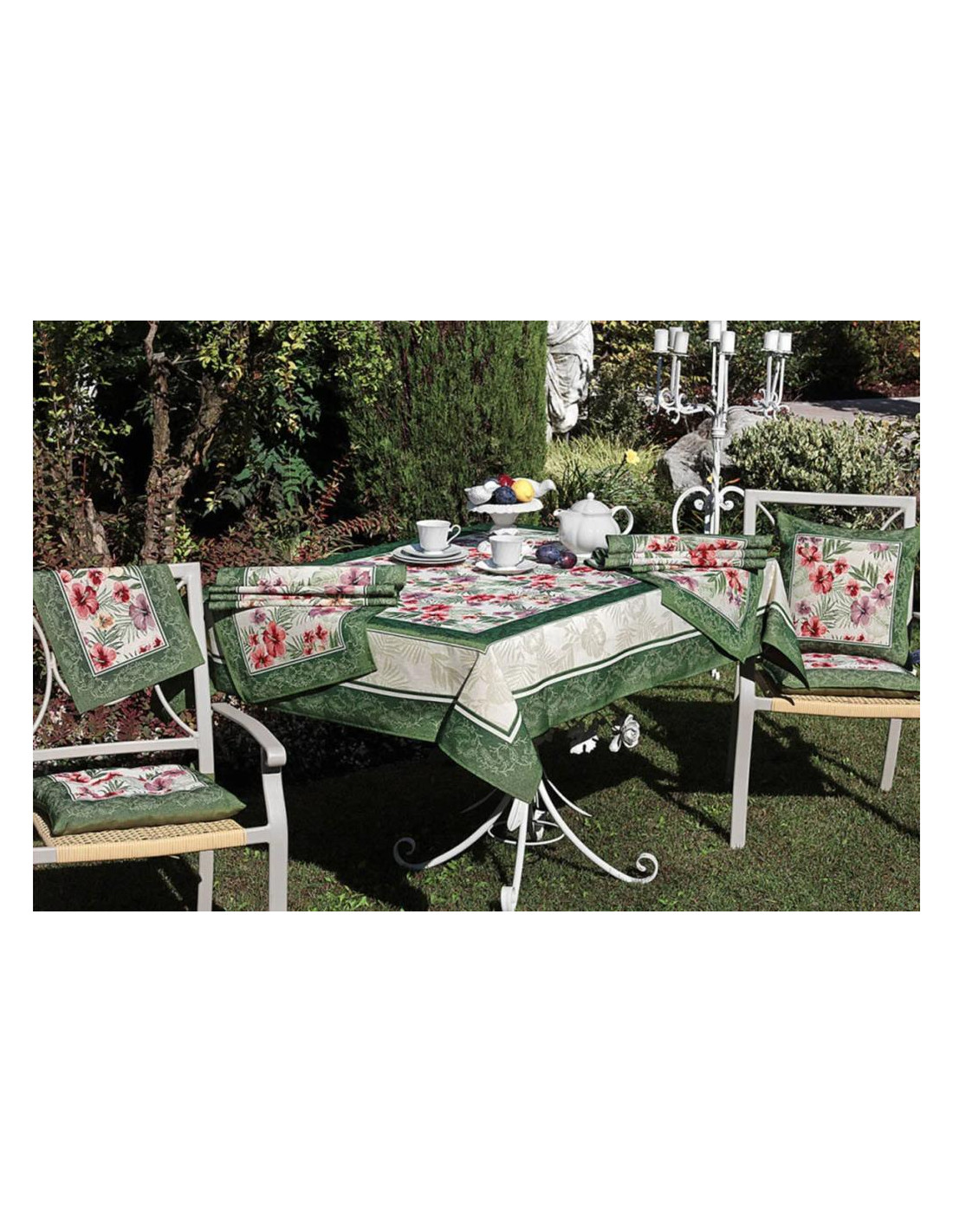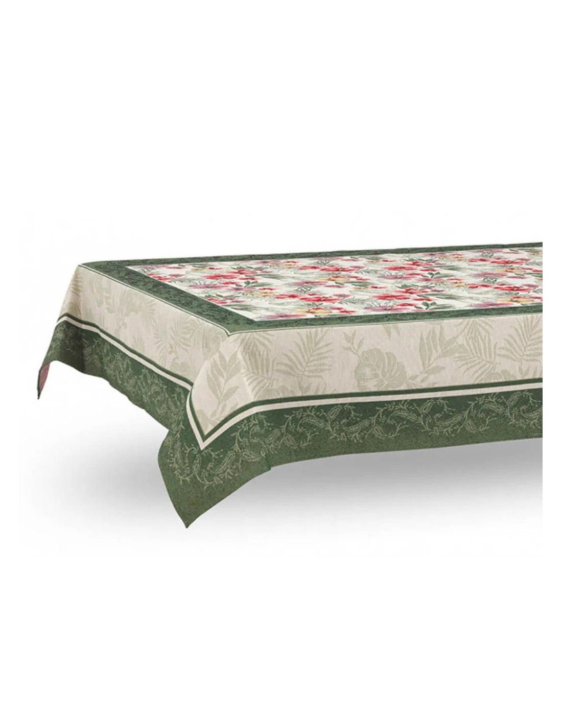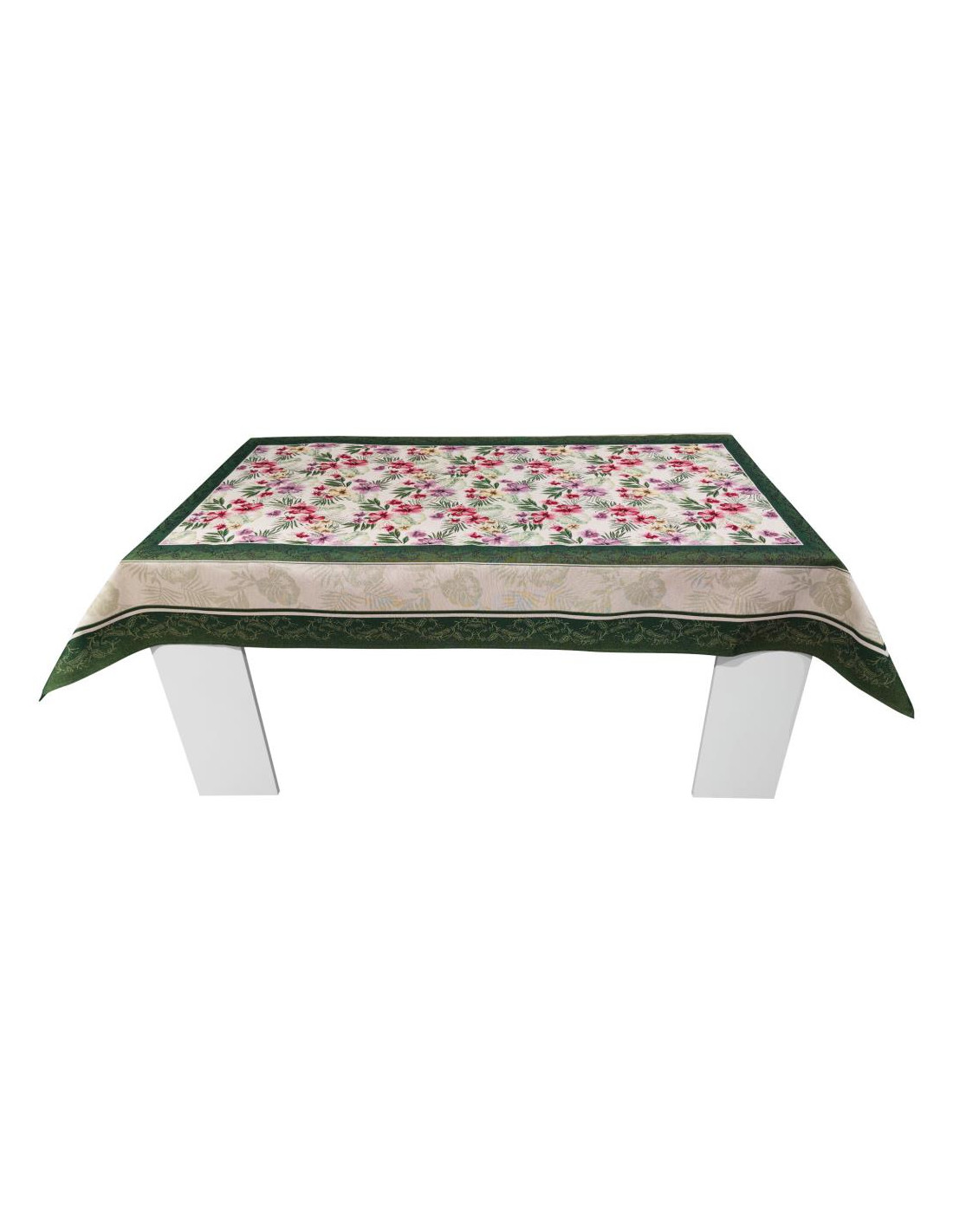 Il Copritavolo in gobelin Howi si articola nel seguente modo: il piano tavola è interamente occupato da una composizione floreale su fondo chiaro; le cadute si compongono di una doppia cornice verde a motivo decorativo separate da un pattern floreale su fondo chiaro.