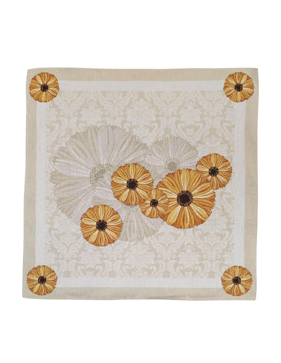 Il copritavola Clizia in gobelin si articola nel seguente modo: il piano tavola è attraversato per intero da un pattern damascato bicolore (panna/beige) sormontato da una composizione di girasoli appoggiati su altri girasoli trattati cromaticamente in modo diverso. Le cadute sono caratterizzate da una doppia cornice panna/beige con agli angoli girasoli che connotano una eleganza e raffinatezza compositiva..