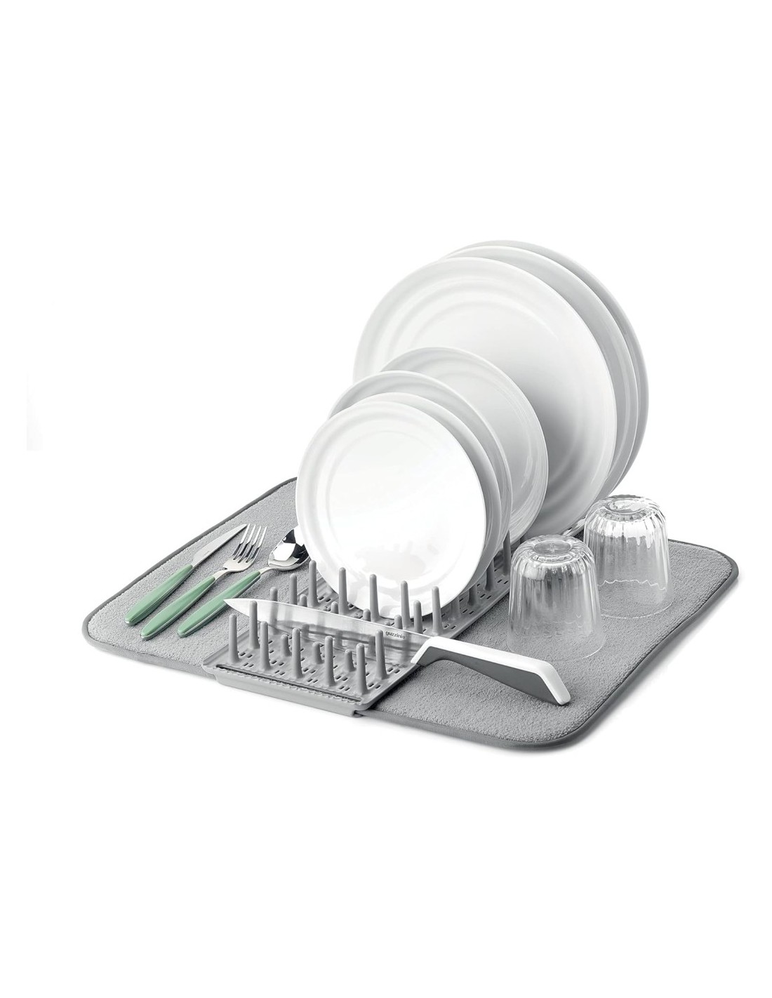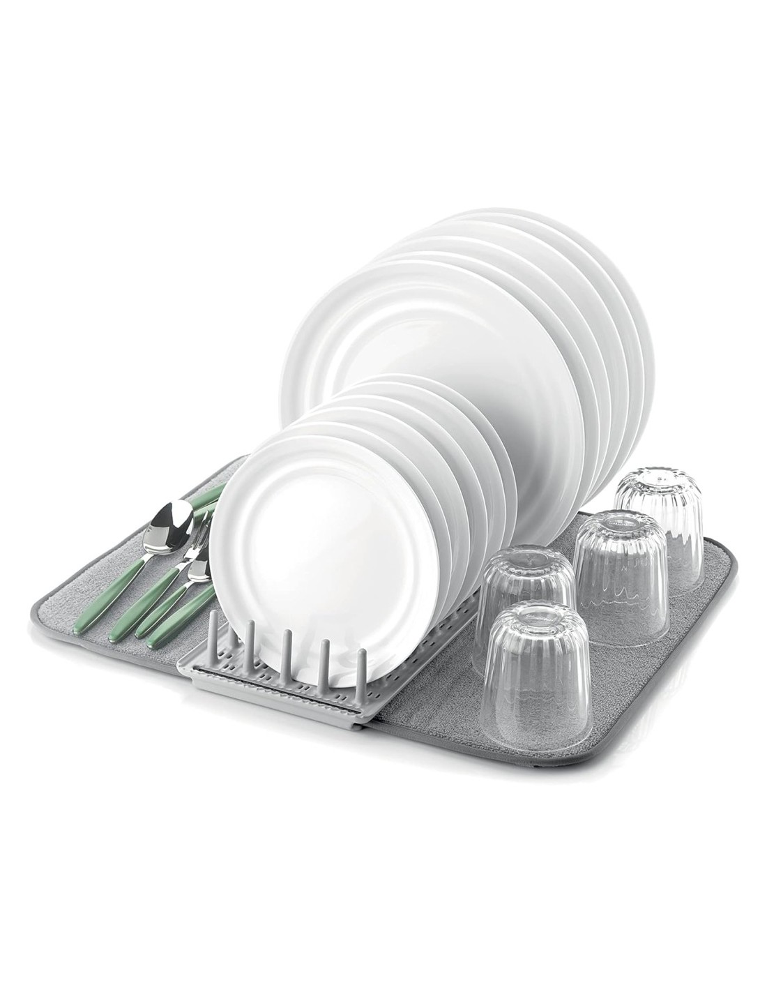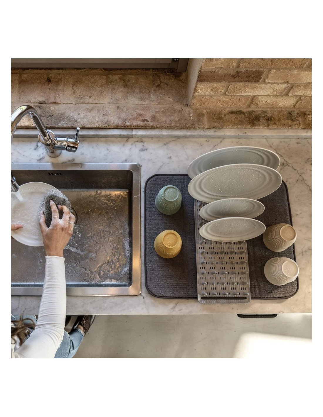 Versatile scolapiatti formato da un pratico tappetino in materiale assorbente e una rastrelliera realizzata riciclando 3,6 flaconi in plastica usa e getta 100% post consumo e antibatterica che ospita fino a 12 piatti.