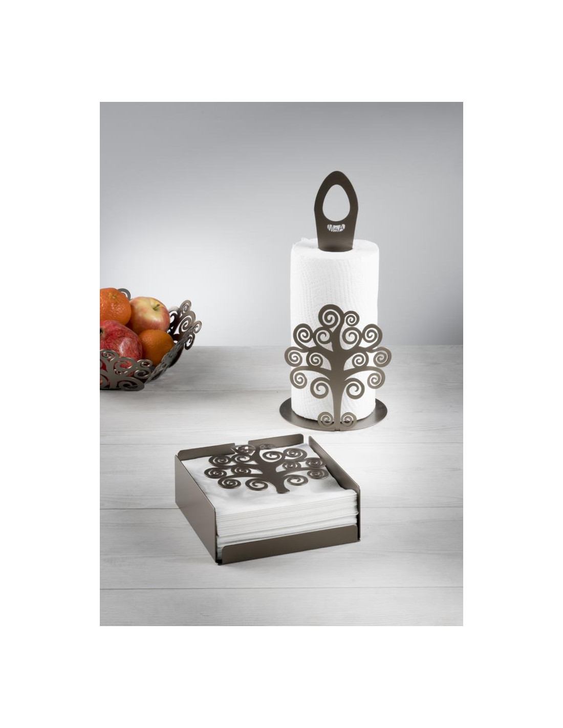 Portarotoli in ferro tagliato laser ispirato al tema dell’Albero della Vita. Una struttura solida e leggera, con uno stile contemporaneo, delicato e giocoso.