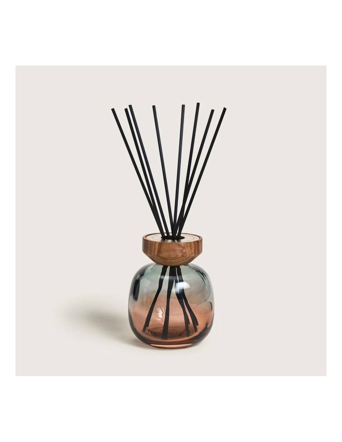 vetro sfumato verde e prugna, impreziosito da un anello in legno e da una placca