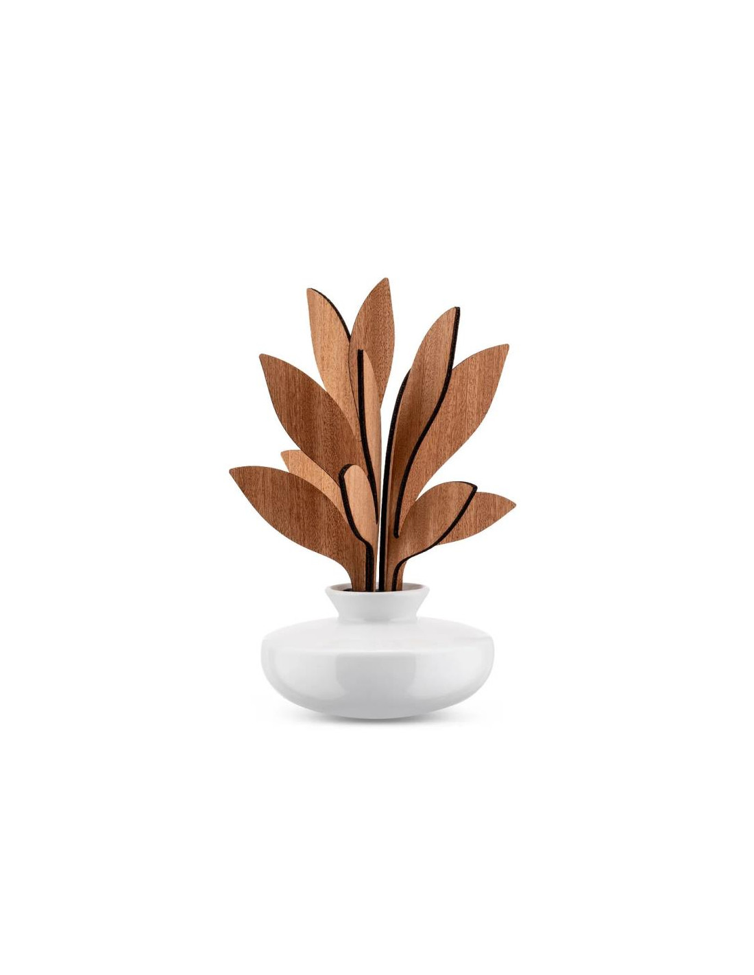 Un diffusore di fragranze per ambiente inedito e sofisticato, che sostituisce i comuni bastoncini con eleganti foglie stilizzate prodotte in legno di mogano. Un modo originale per diffondere i profumi