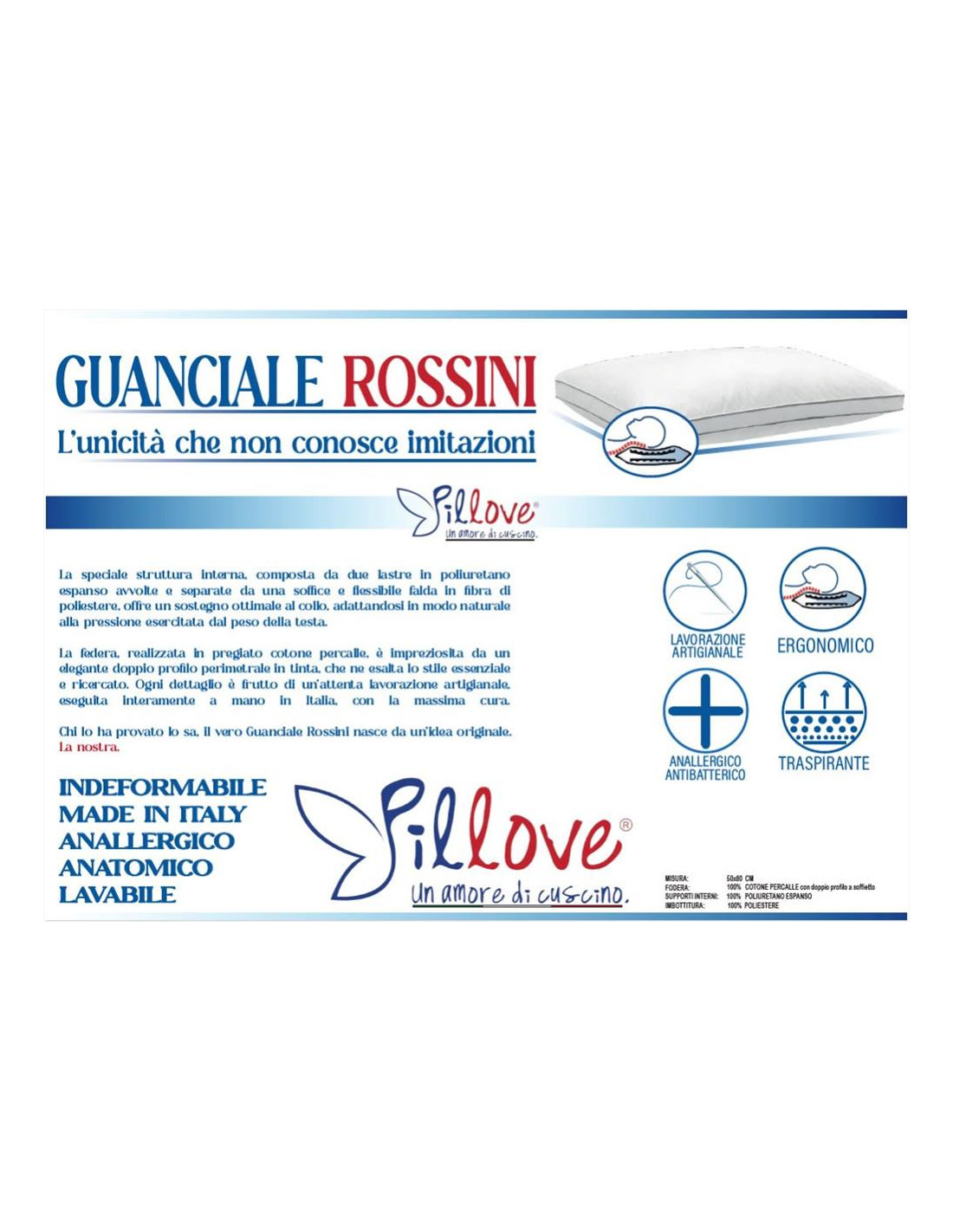 PILLOVE GUANCIALE 50 X 80 CM IN FIBRA DI POLIESTERE - ROSSINI