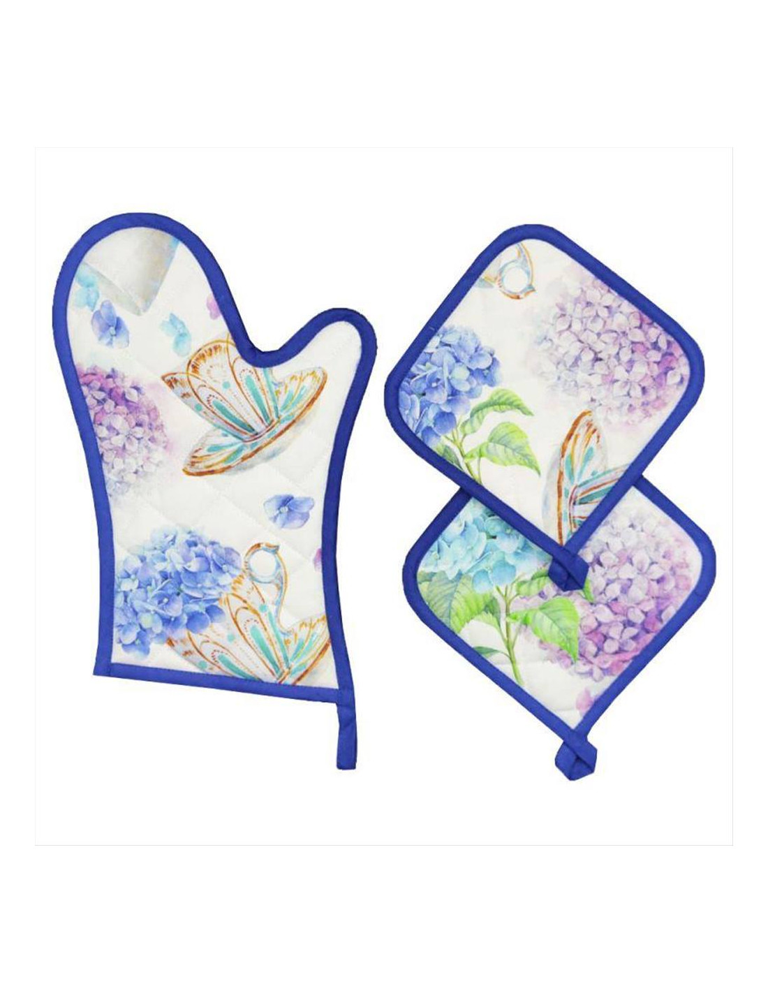 Set guanto e presine in puro cotone trapuntato con bordino tinta unita a tema Floreale.