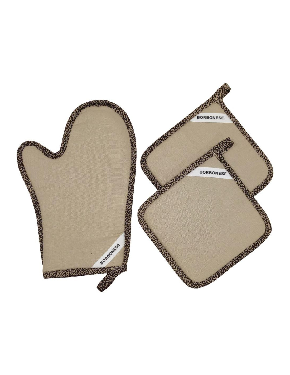 Set 1 Guanto da cucina e 2 Presine quadrate 18 x 18 cm Borbonese in panama tinta unita 100% cotone con bordi applicati stampati con design personalizzato dall’iconica texture “OP' Occhio di Pernice..