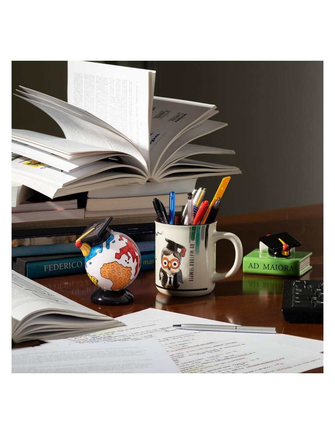 Un mappamondo in ceramica smaltata decorata a mano. Ideale come simpatica ed originale bomboniera di laurea.
