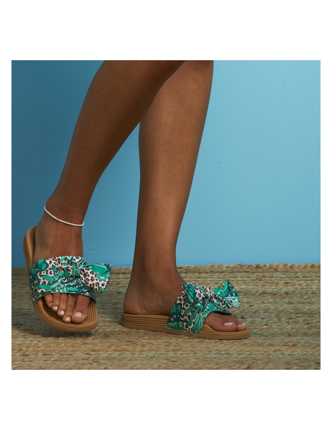 Ciabatte da donna fantasia Mucalato/Palma, rifinite con fiocco.