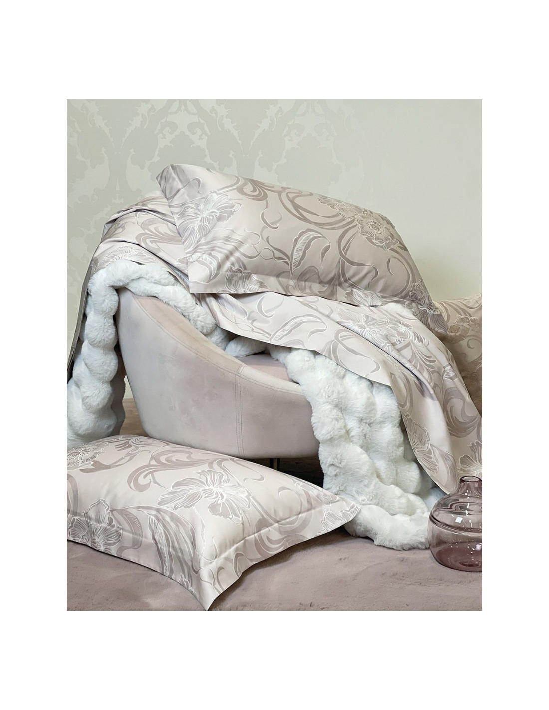 Completo lenzuola matrimoniale Blumarine collezione Pergola in Raso di puro cotone con stampa all-over su federe a 3 volani e sul lenzuolo sopra, lenzuolo sotto in raso tinta unita, logo stampato nella trama.