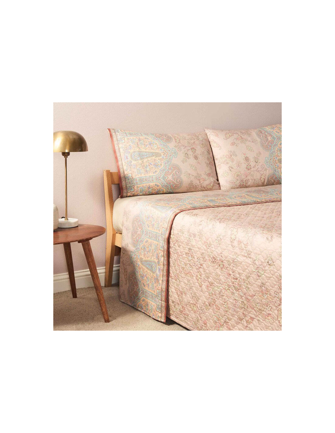 Un prezioso ramage dal sapore orientale si ispira ai dettagli degli antichi tessuti persiani e indiani che sono rivisitati con un’eleganza ricercata creando una versione moderna dell’albero della vita. Nella parte centrale del disegno i fiori tono su tono sono declinati in nuances delicate, mentre sulla balza decorativa i ricchi elementi floreali mixati ai motivi paisley sono valorizzati da colori più decisi e brillanti. Il disegno è proposto nei toni delicati del sabbia, del rosa cipria, dell’avorio e del color pesca .