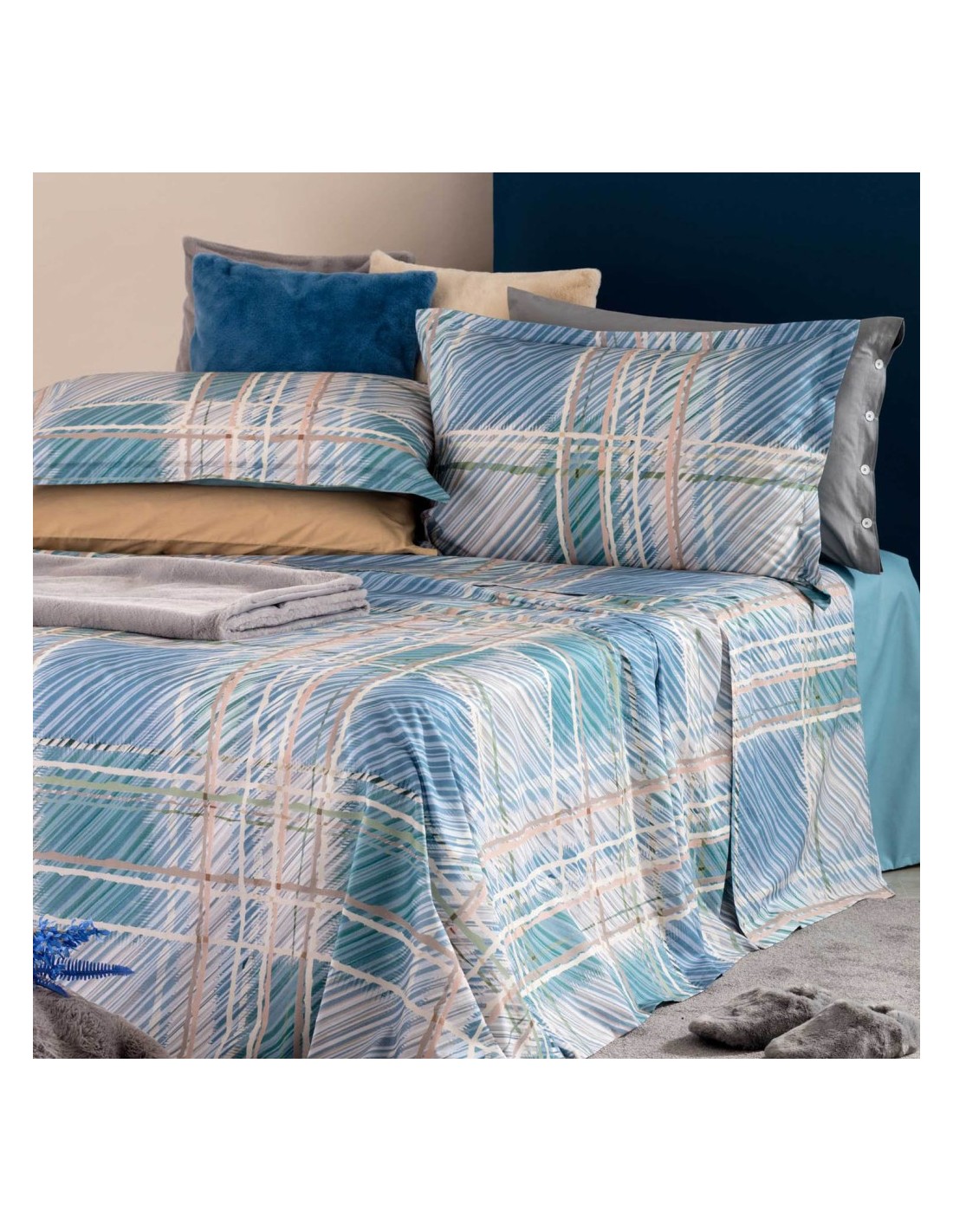 Il completo lenzuolo copriletto Yuta fonde estetica contemporanea e comfort naturale, grazie a una stampa digitale ad alta definizione su percalle 100% cotone. Il disegno tartan, composto da linee leggere e intrecci dinamici, si sviluppa sulla balza del lenzuolo e sul fronte delle federe con effetto copriletto, conferendo al letto un aspetto elegante e ordinato anche quando non è utilizzato.