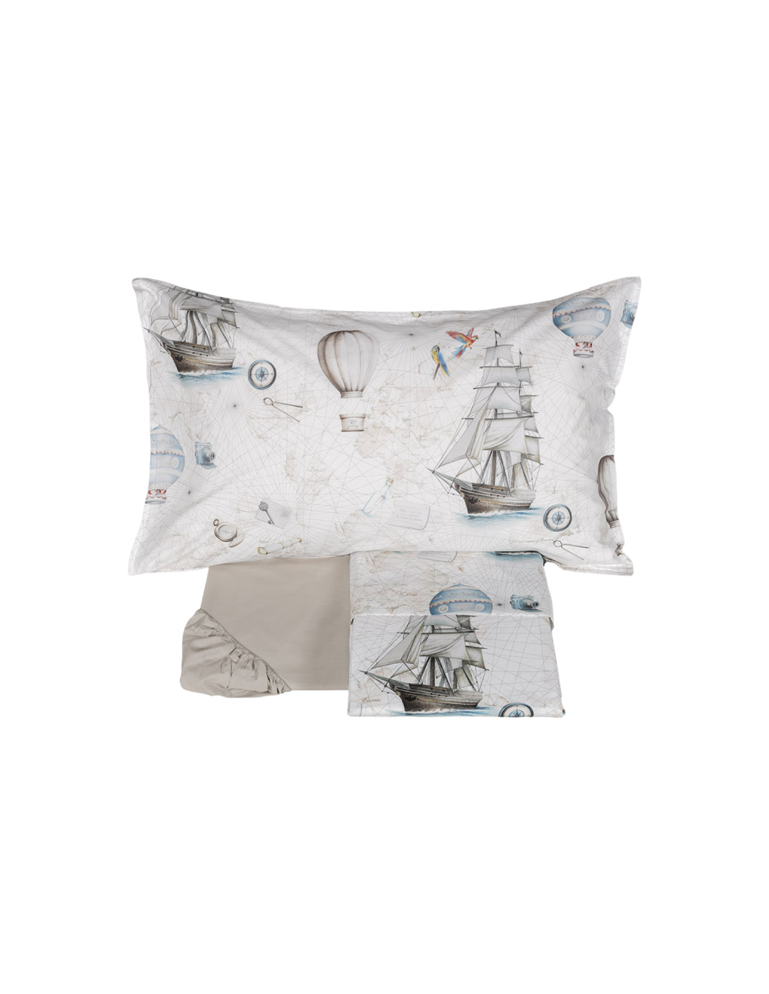La collezione MAGELLANO richiama il fascino del viaggio antico: il lenzuolo copriletto, totalmente stampato, mostra velieri, mongolfiere, cannocchiali, bussole e altri strumenti antichi con qualche uccello dal piumaggio colorato su uno sfondo che richiama vecchie carte di navigazione. Un letto accattivante per i più giovani, trasportati in una emozione senza tempo.