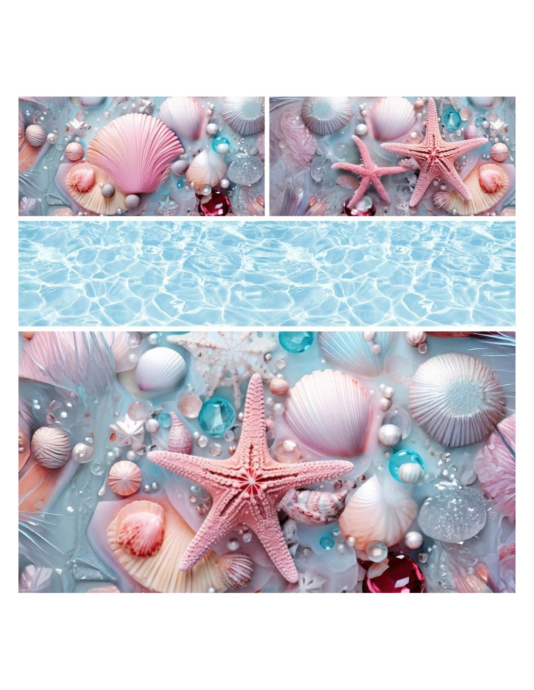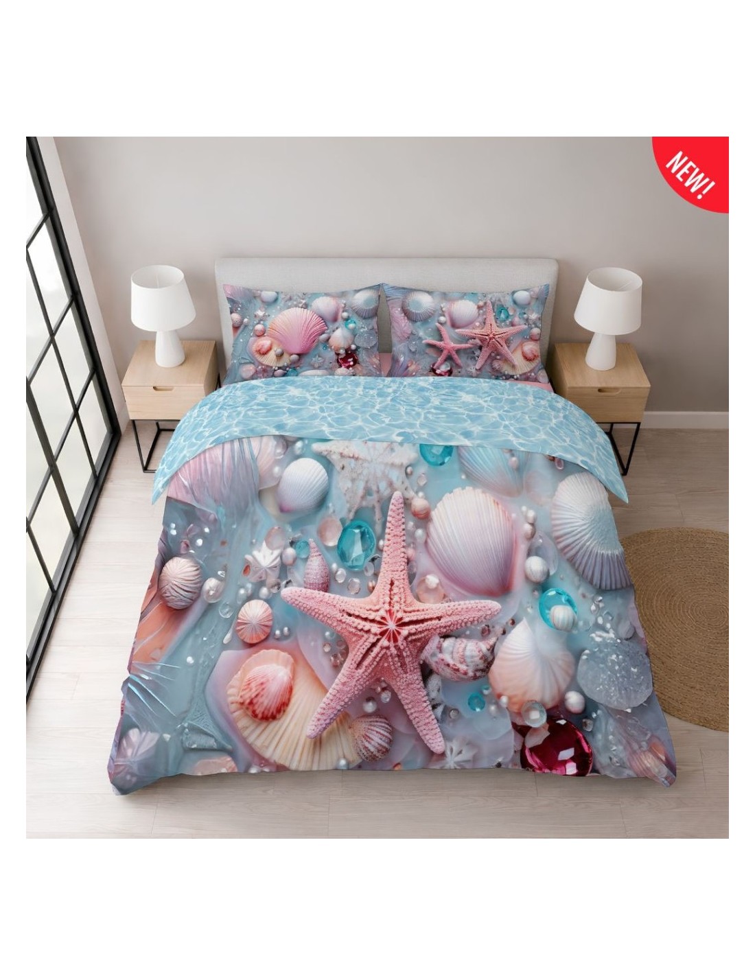 Questa parure in stampa digitale cattura la magia incantata dei fondali marini, trasformando il letto in una composizione artistica di conchiglie, stelle marine e perle luminose. Le tonalità pastello del rosa e dell’azzurro si fondono con dettagli cristallini e sfumature madreperlate, creando un’atmosfera sognante, eterea e ricca di luce. Grazie all’altissima definizione del disegno, ogni elemento sembra affiorare dolcemente dal tessuto, offrendo un’esperienza visiva raffinata che evoca la quiete e la bellezza dei tesori dell’oceano.