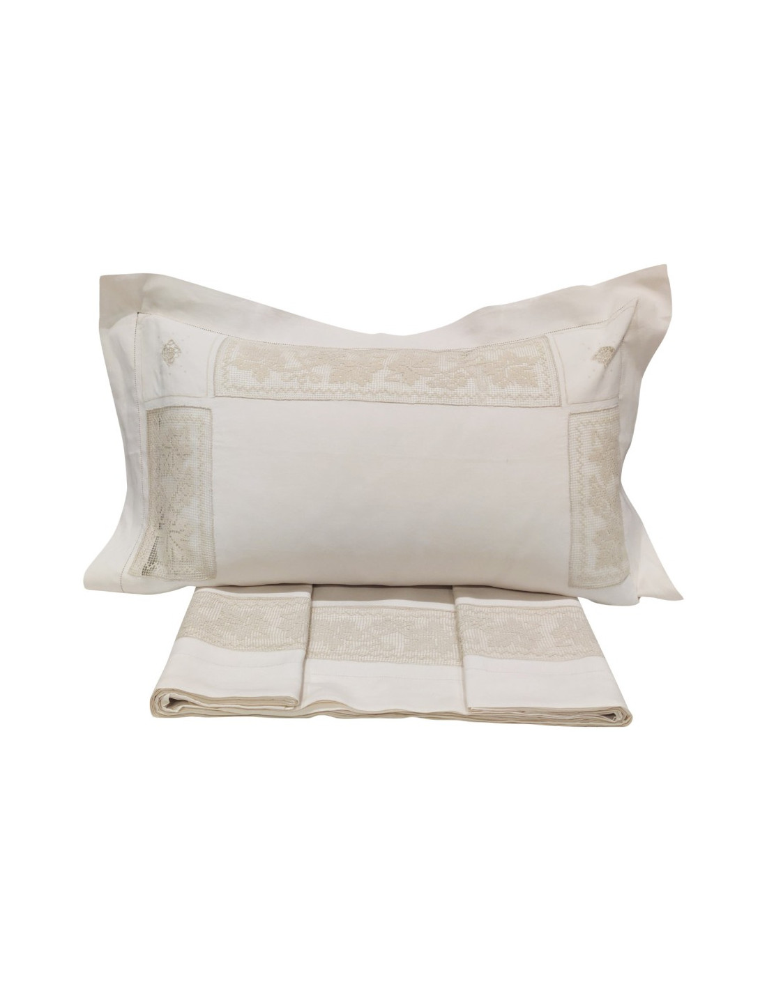 PARURE LENZUOLA 2 PIAZZE IN PURO LINO CON PIZZO FILE E RCIAMI
