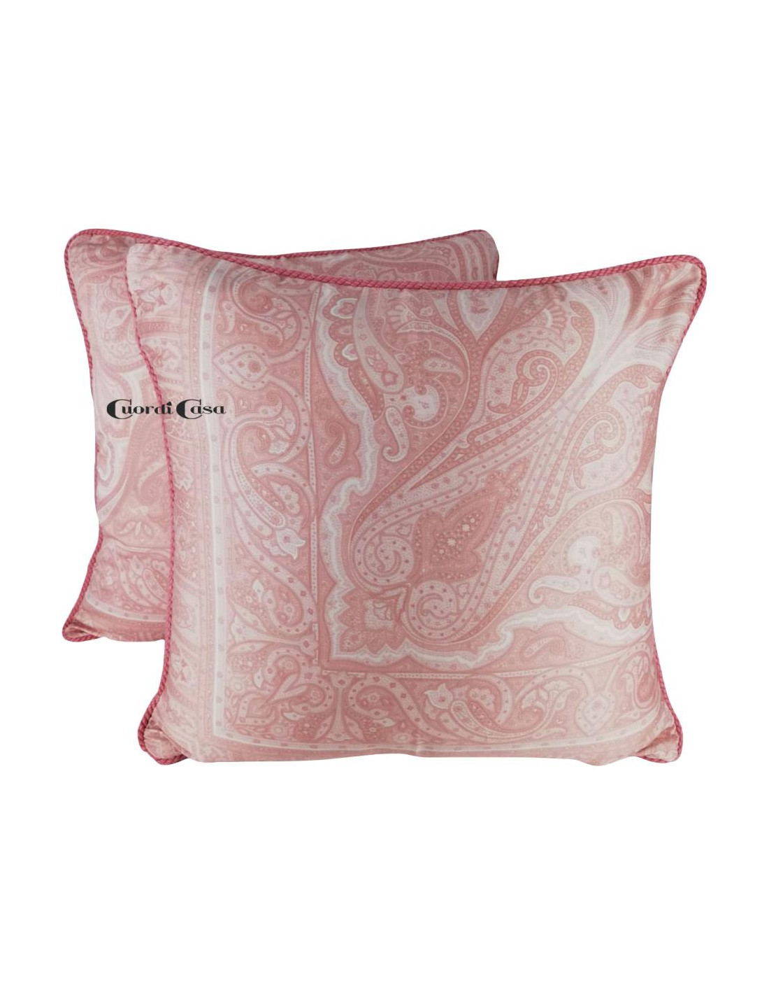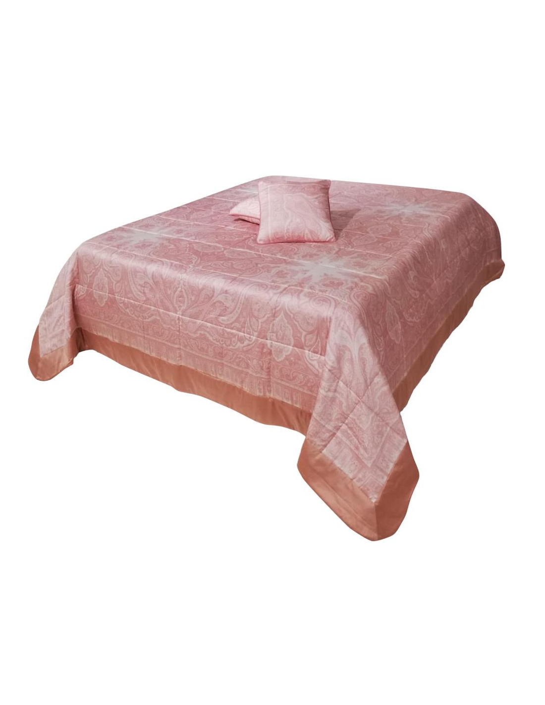 Trapuntina Etro matrimoniale in raso di puro cotone, fantasia paisley su fondo rosa, rifinita con bordo tinta unita e 2 cuscini arredo con cordino.