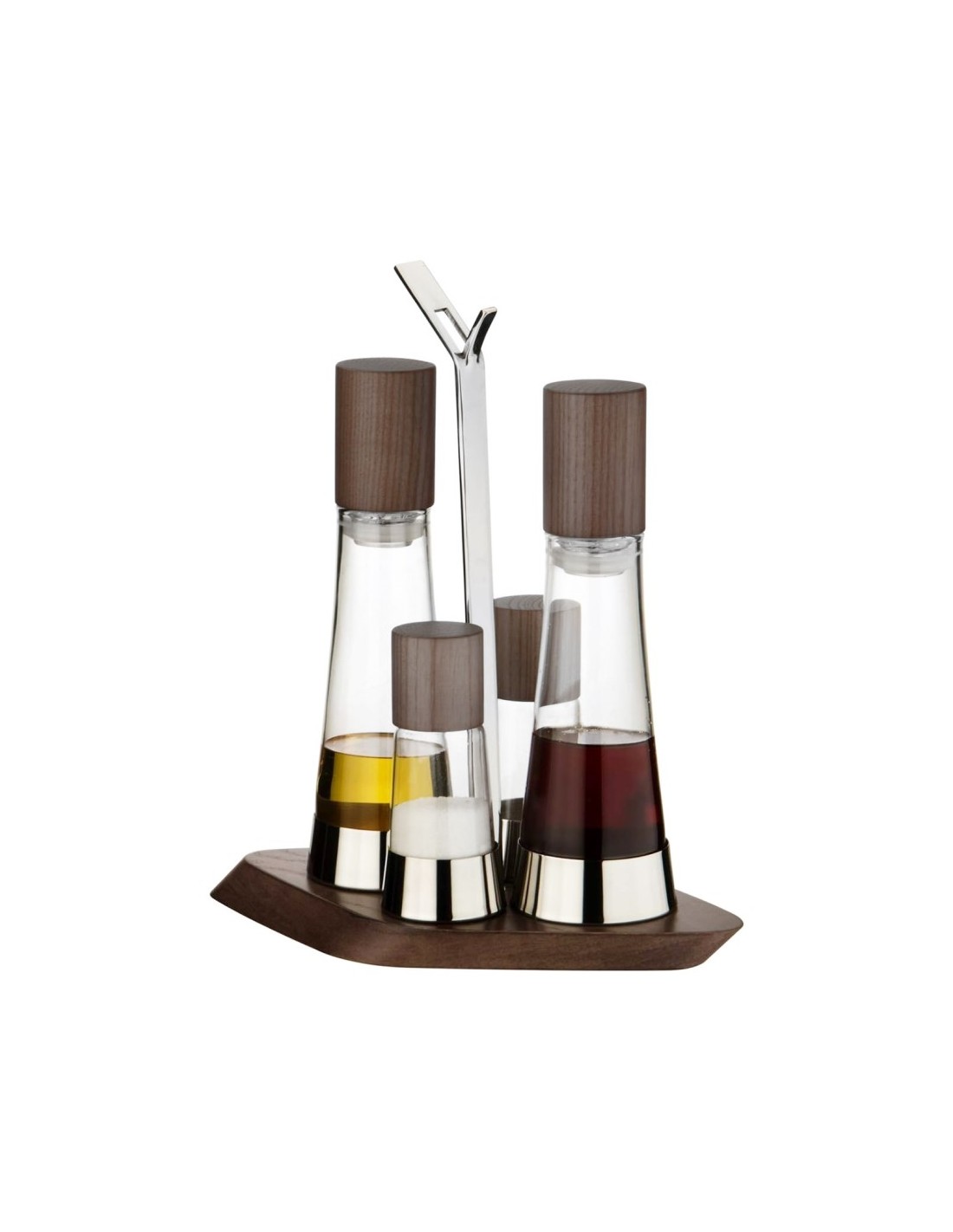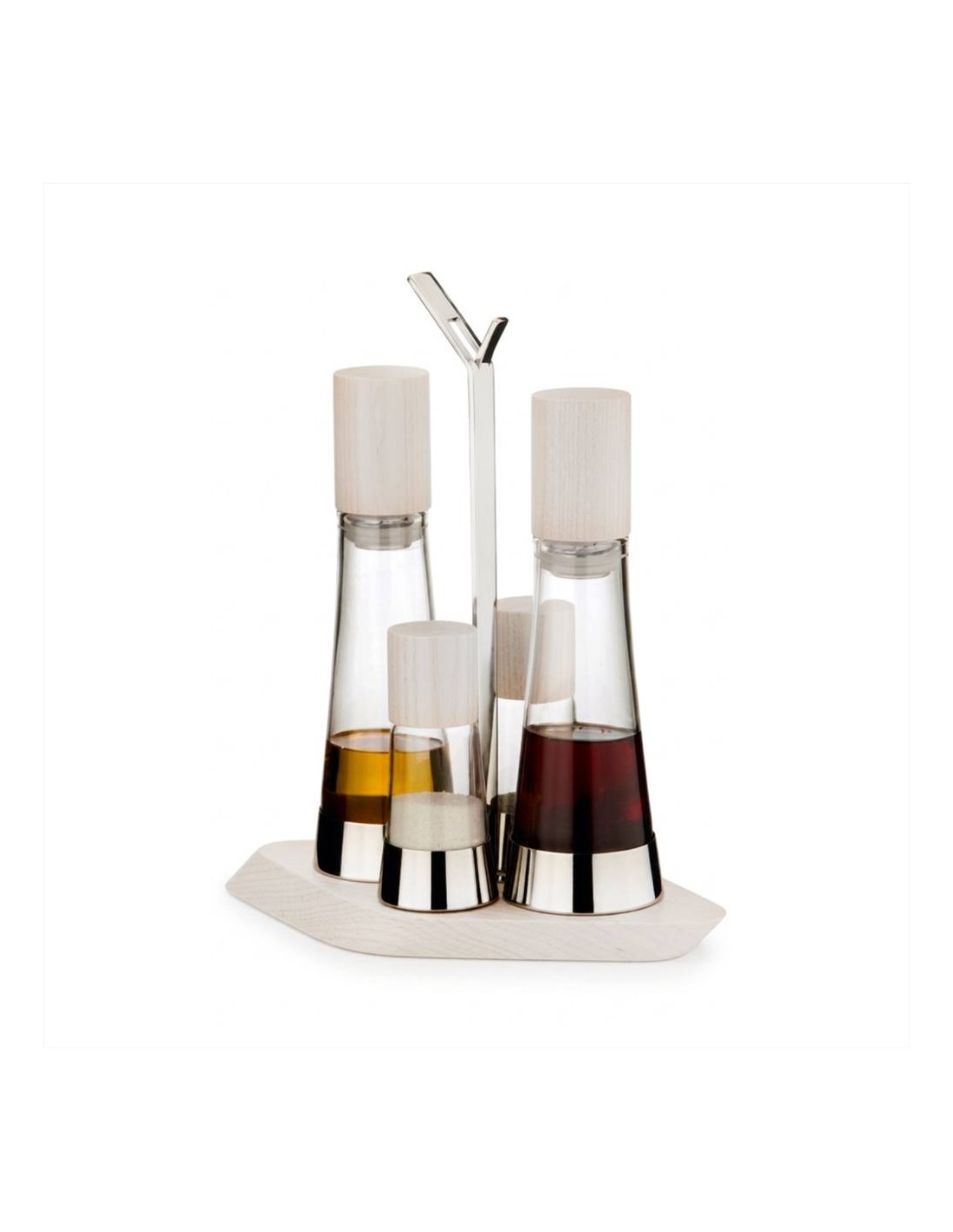 Menage in frassino, composto da 4 pezzi, con ampolle in vetro, tappi e
