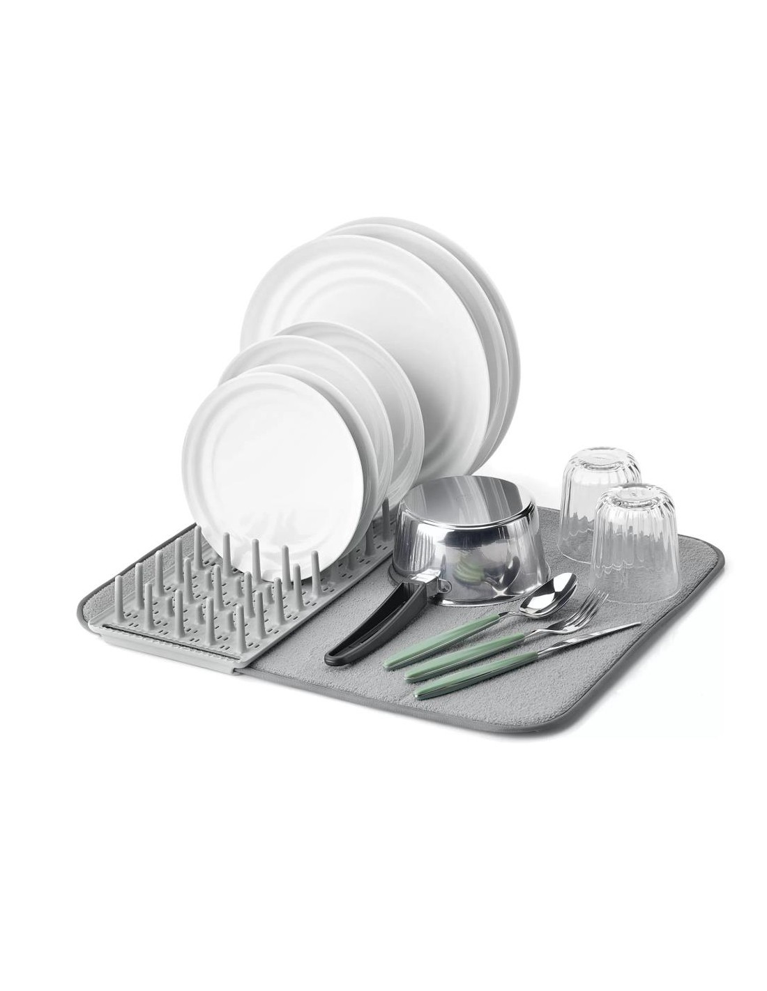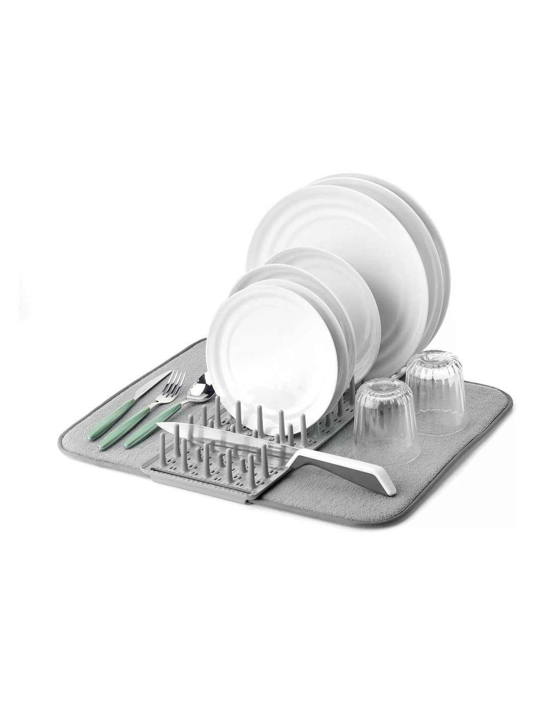 Inoltre, è salvaspazio poiché basta avvolgere il tappetino intorno allo scolapiatti e fissarlo con la cinghia elastica incorporata per ridurre notevolmente le sue dimensioni e riporlo facilmente in un armadietto o sotto il lavandino.