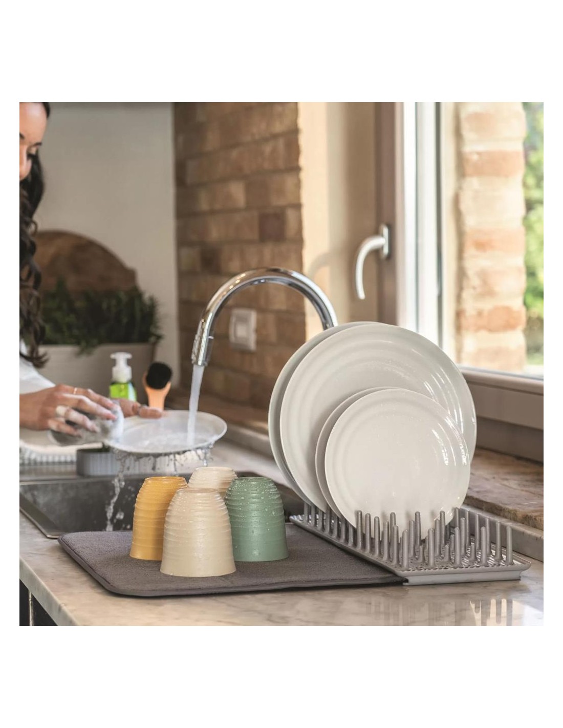 Lo scolapiatti è molto pratico perché smontabile: la rastrelliera può essere lavata in lavastoviglie e il tappetino in lavatrice.