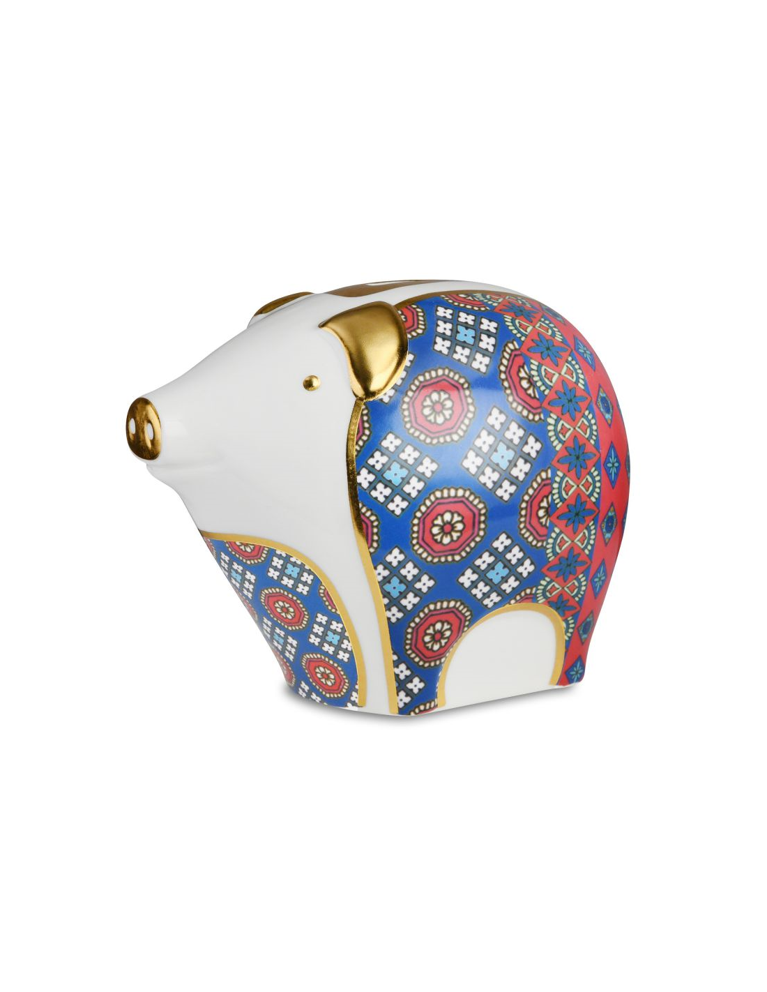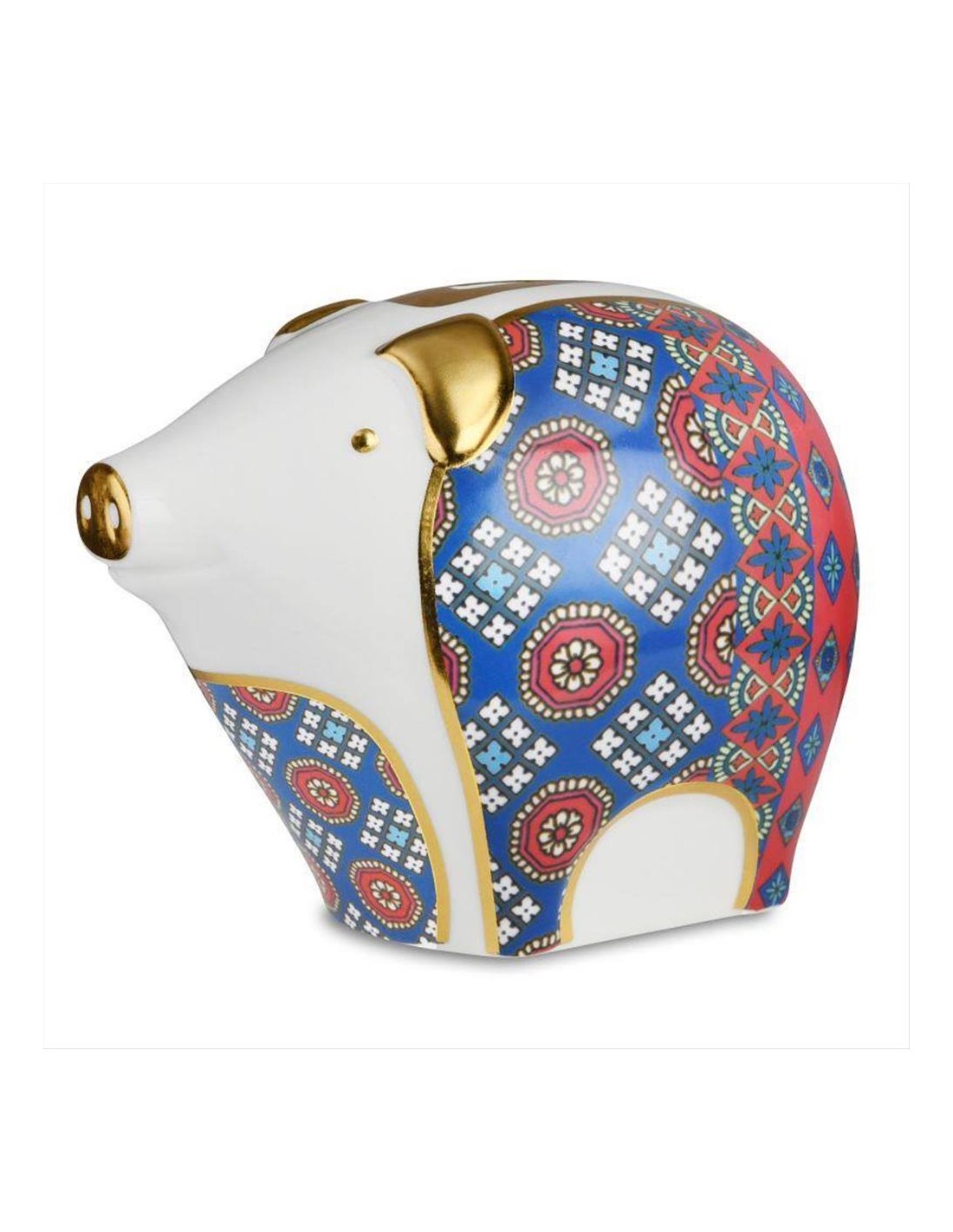 Salvadanaio porcellino in porcellana finemente decorata e con rifiniture in