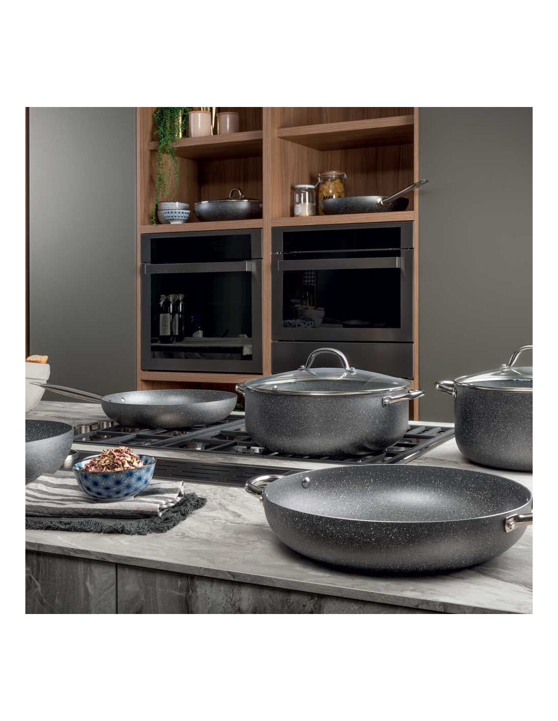 Raffinata e di design, ha un corpo in alluminio stampato con un rivestimento interno antiaderente rinforzato a 4 strati, e un manigliame ergonomico e professionale in acciaio inox che gli conferisce stile ed eleganza.