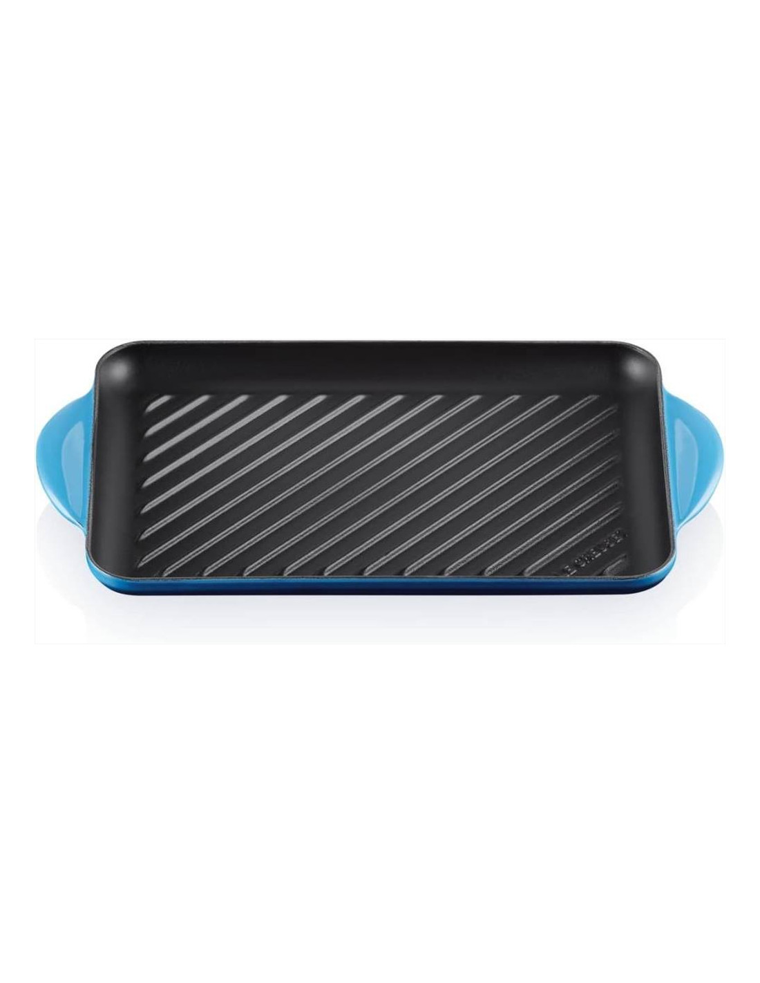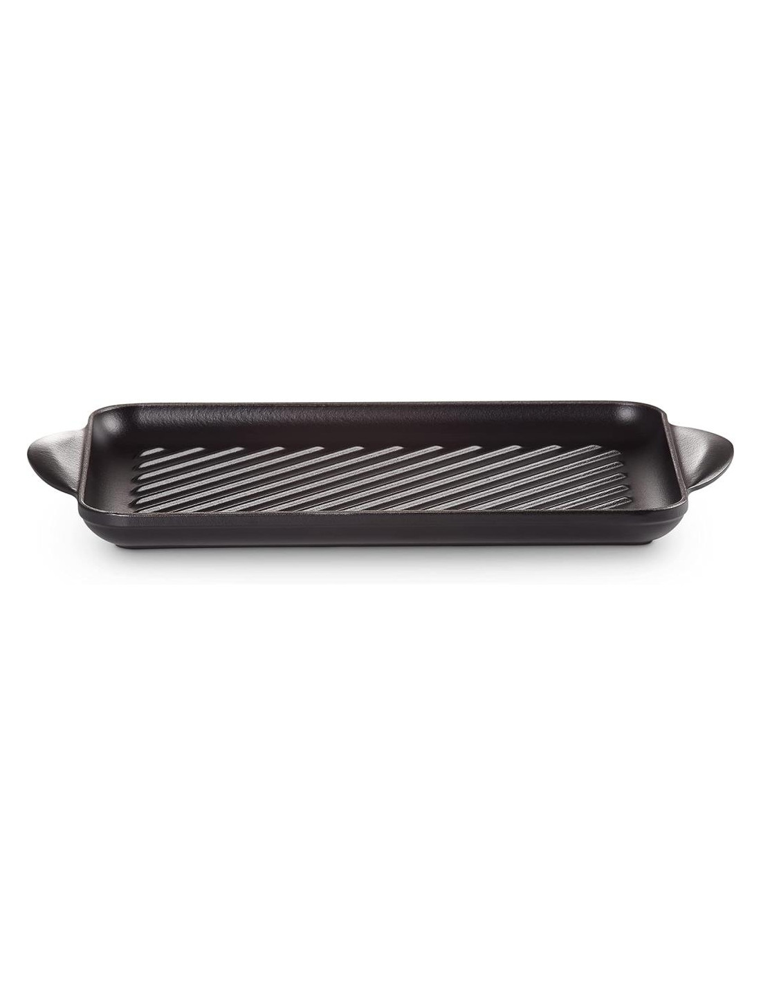 Grill rettangolare in ghisa vetrificata con superficie scanalata.
