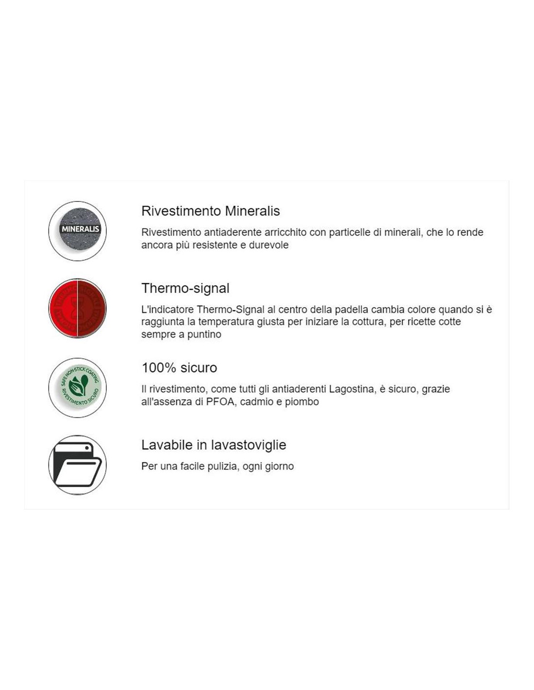 Lagostina: quando si raggiungono i 180° il bollo al centro cambia colore indicando il momento corretto per iniziare a cucinare.