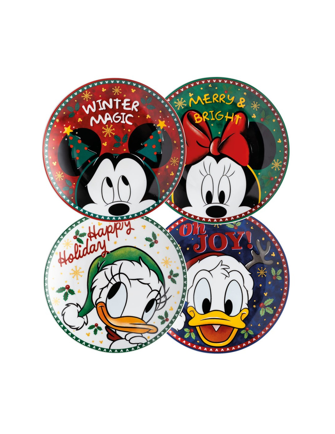 Ogni piatto è decorato con gli iconici personaggi Disney: Mickey, Minnie, Donald e Daisy.