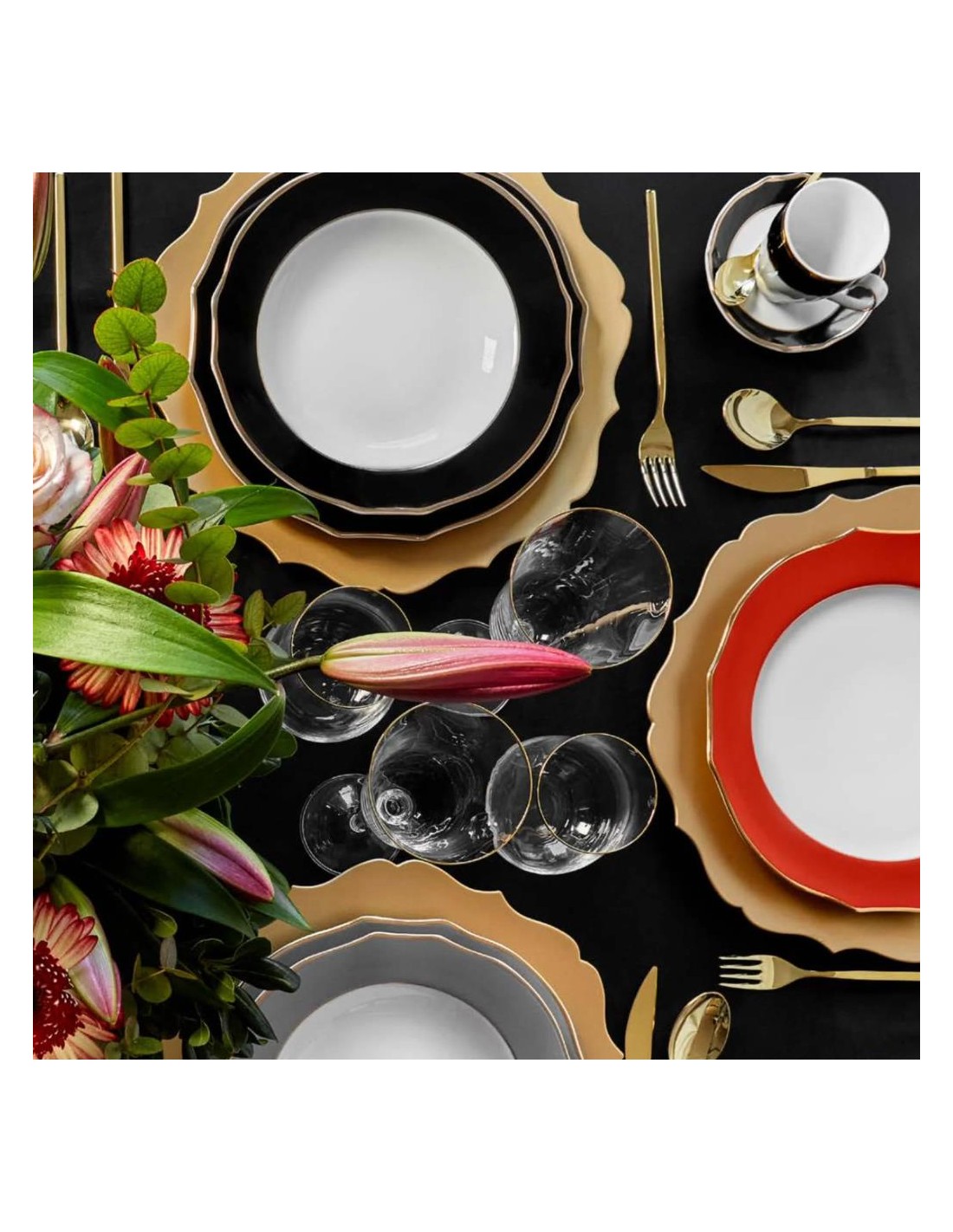 Dettagli in Oro: Ogni pezzo è rifinito con un elegante filo d'oro, aggiungendo un tocco di lusso e raffinatezza alla tua tavola.