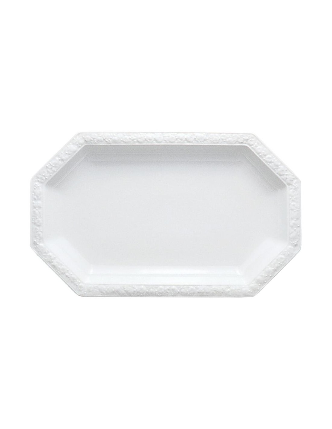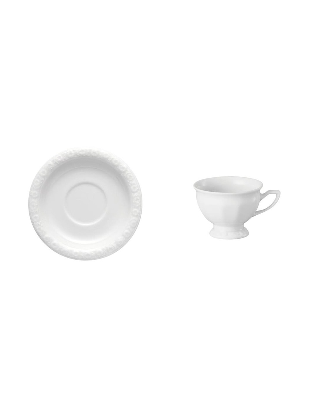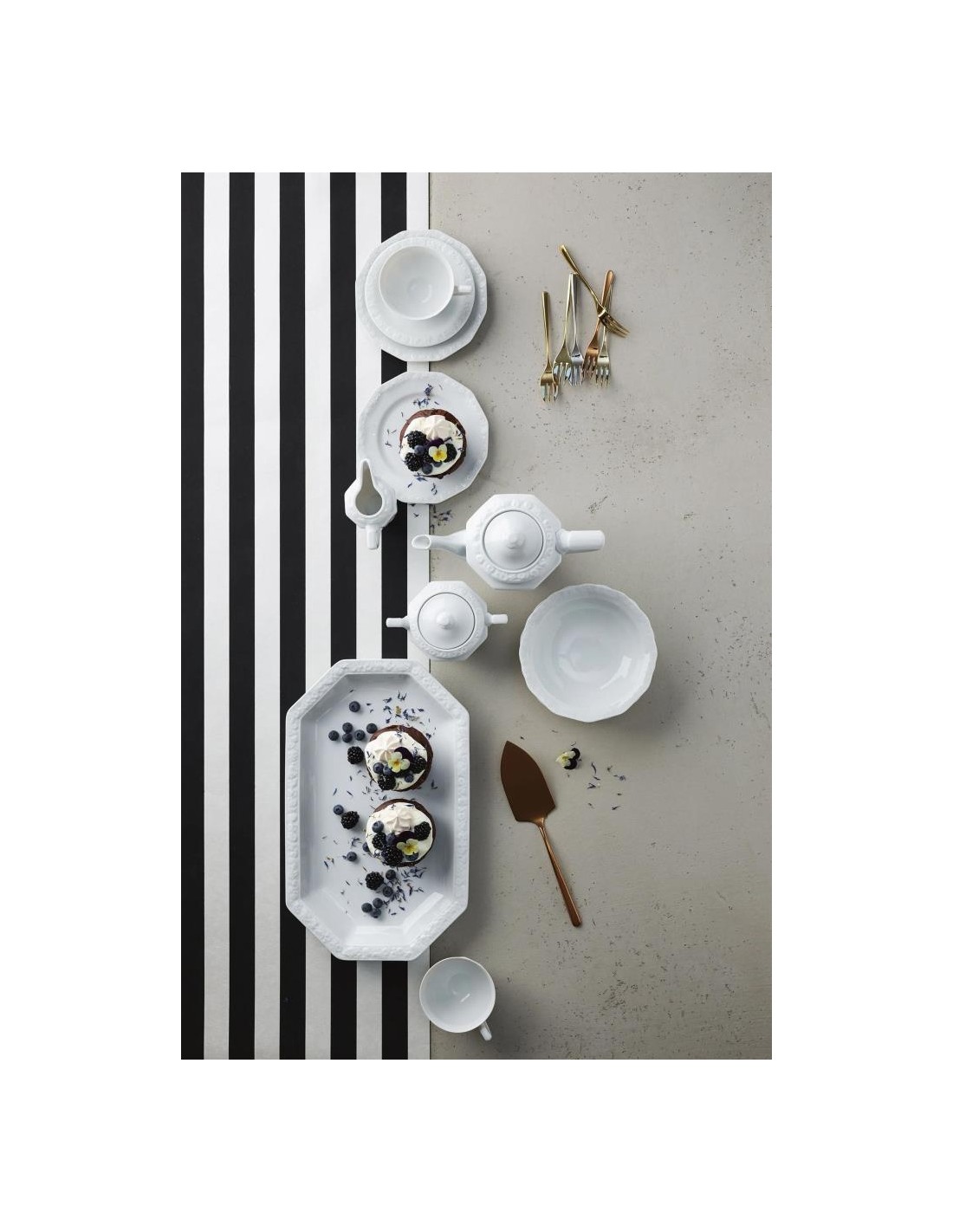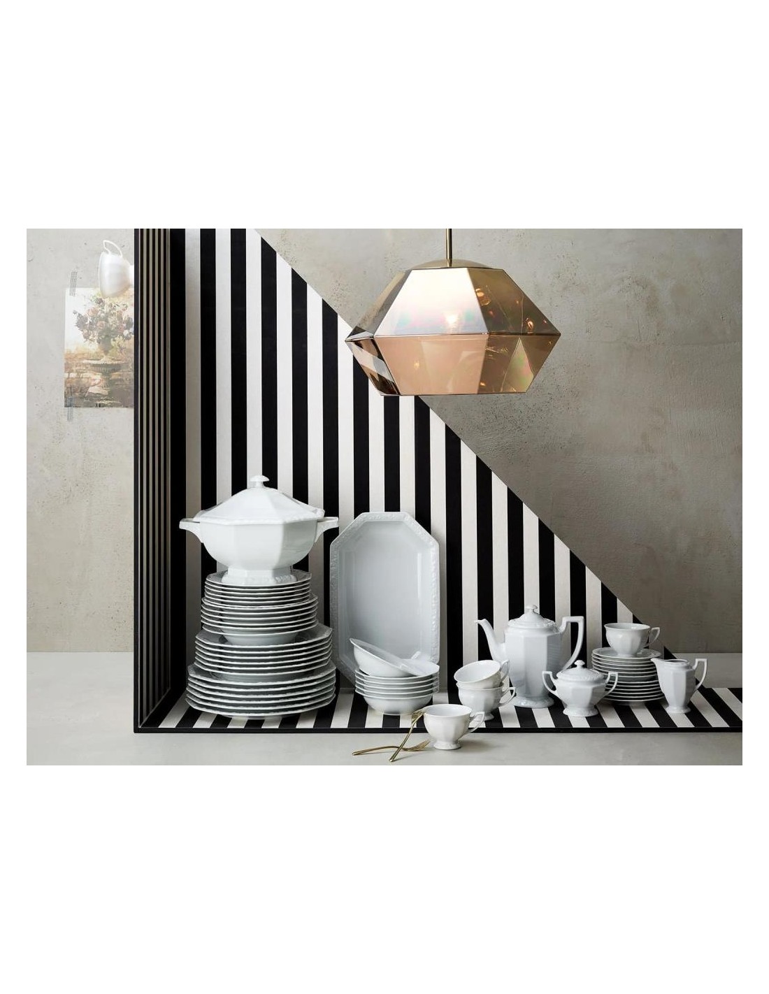 12 tazze espresso 80 ml con piattino coordinato, 1 zuccheriera Ø 15,2 x H10,3 cm, 1 piatto portata rettangolare Ø 38 cm.
