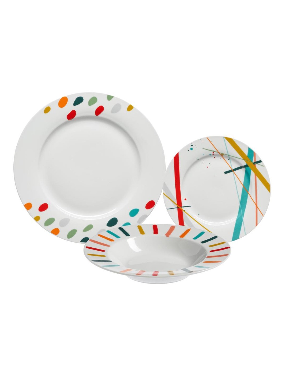 Servizio piatti giornaliero in porcellana bianca decorata con colori vivaci.