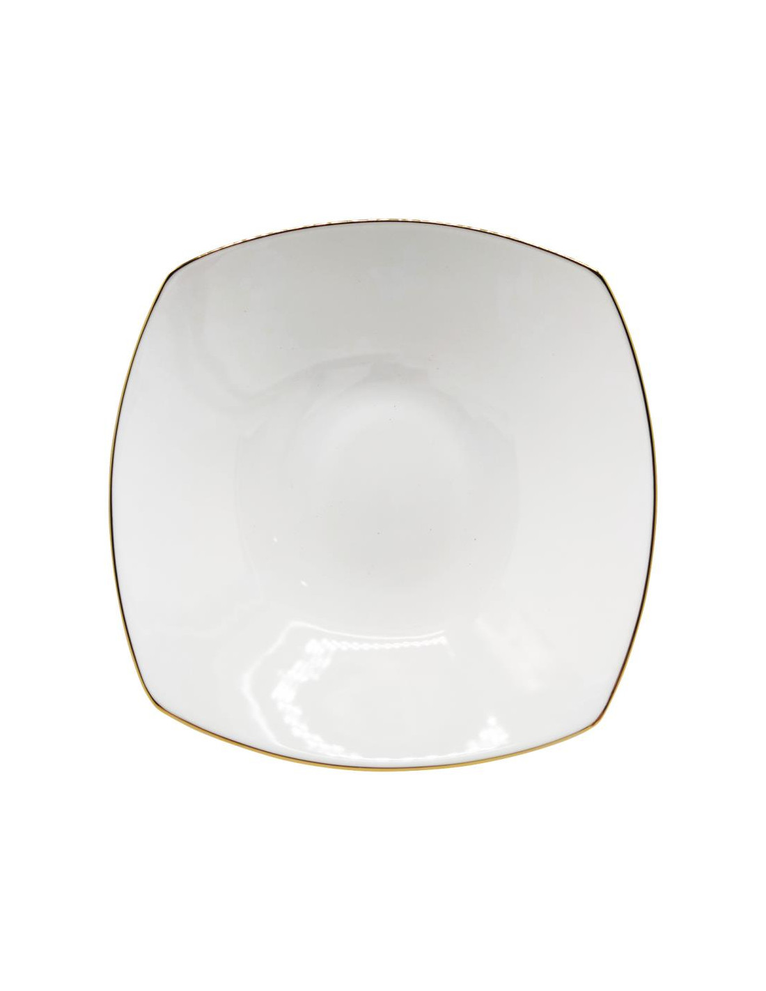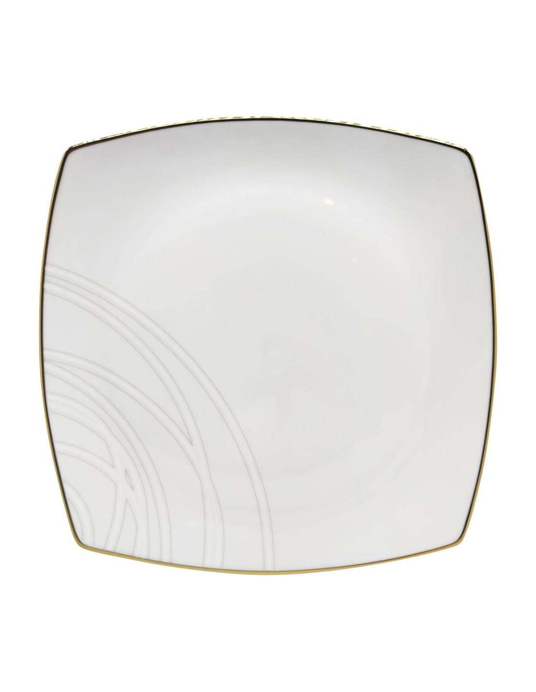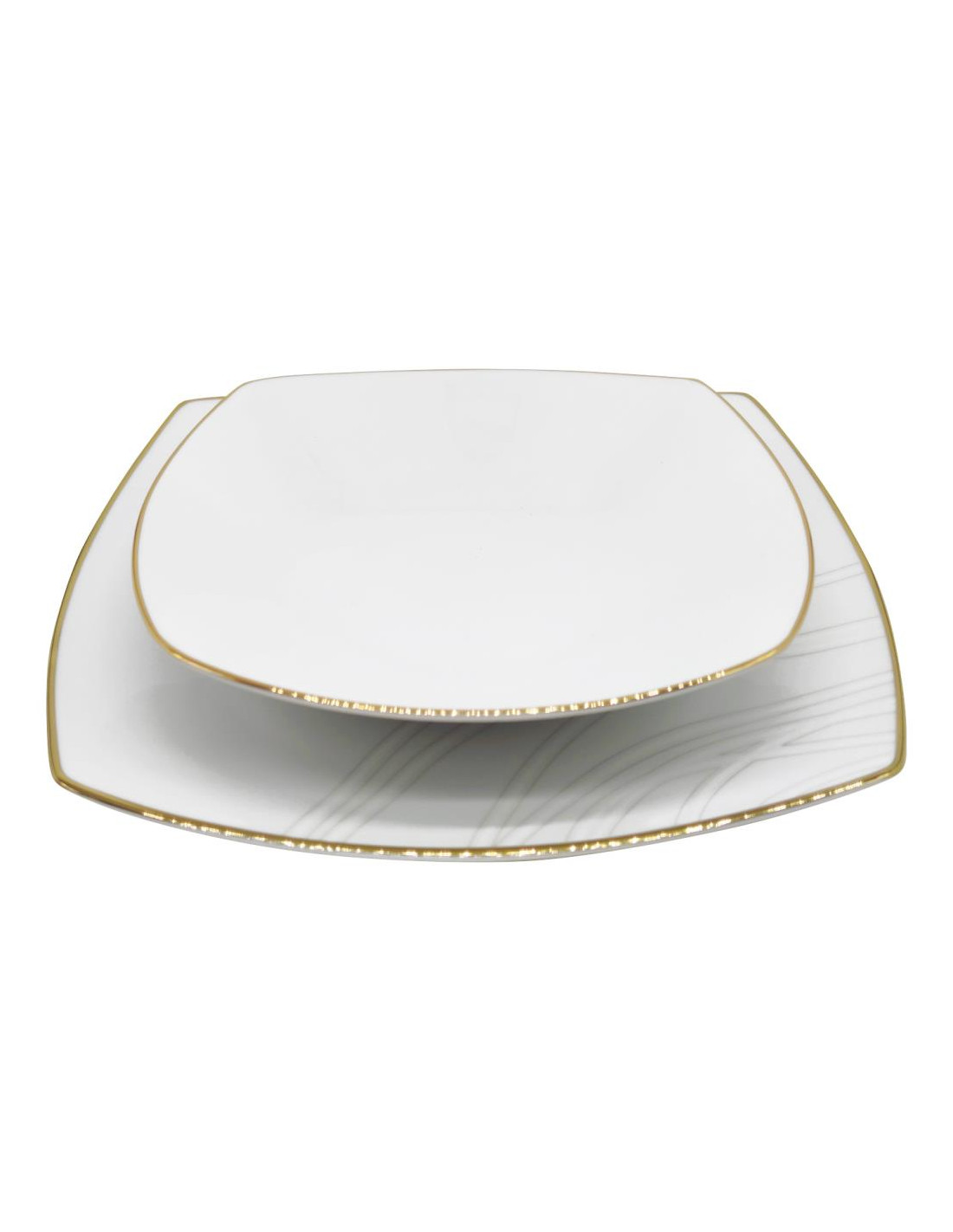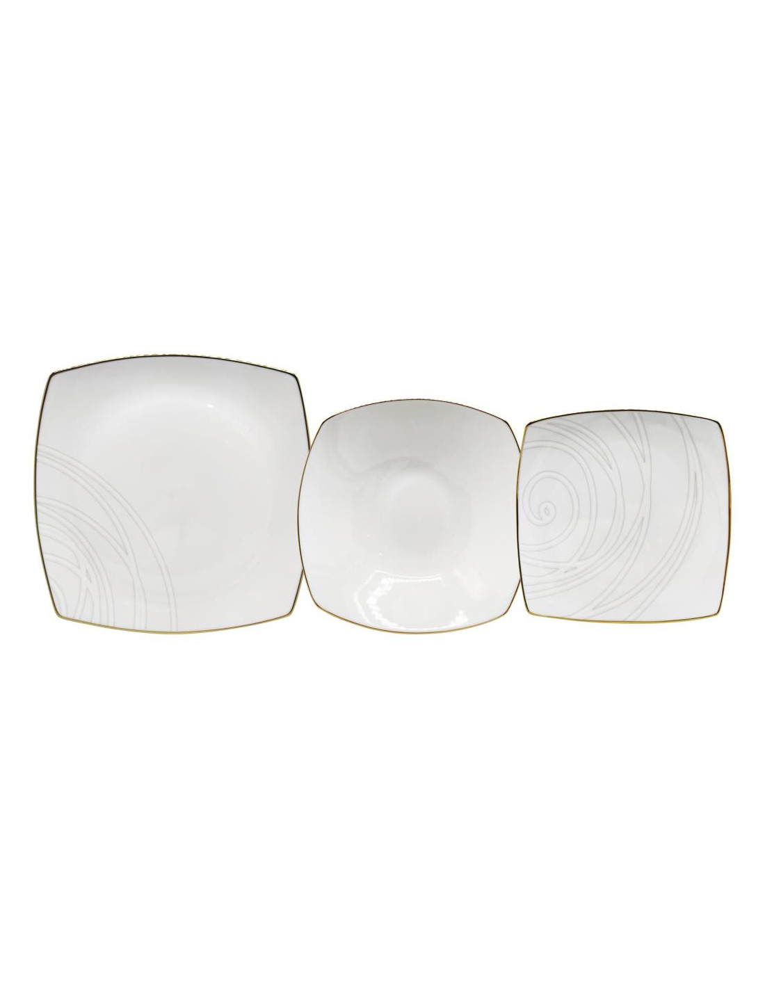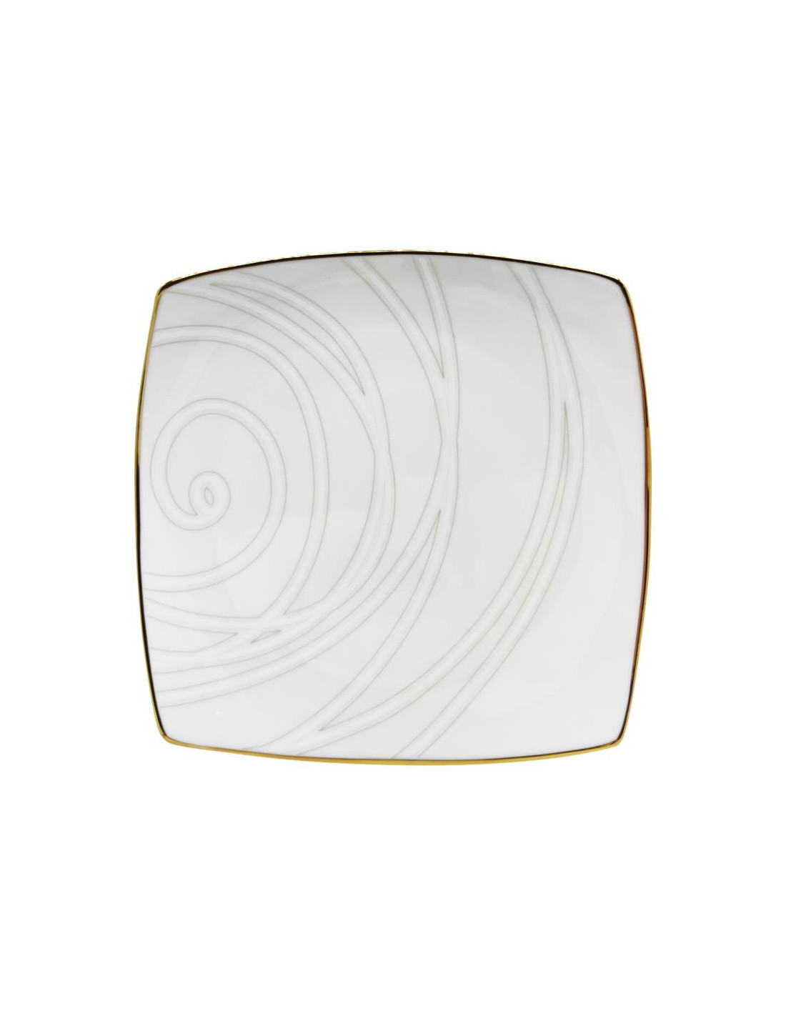 Servizio piatti quadrati eleganti in porcellana bianca con bordo in filo oro e decorata da linee sinuose e curve, creando un effetto a spirale.