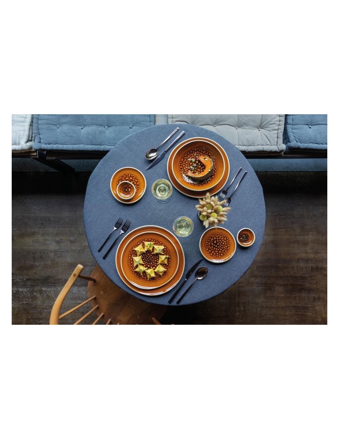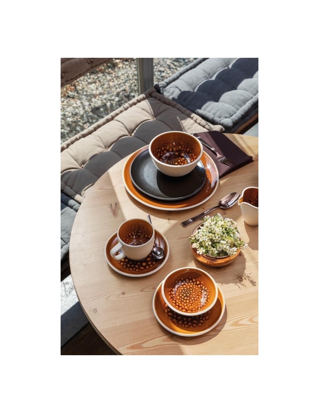 Le stoviglie emanano calore e sono particolarmente belle se abbinate a Junto Slate Grey. Anche se non esistono due piatti uguali, Amber appare calmo ed equilibrato, soprattutto grazie al suo caldo colore ambrato.