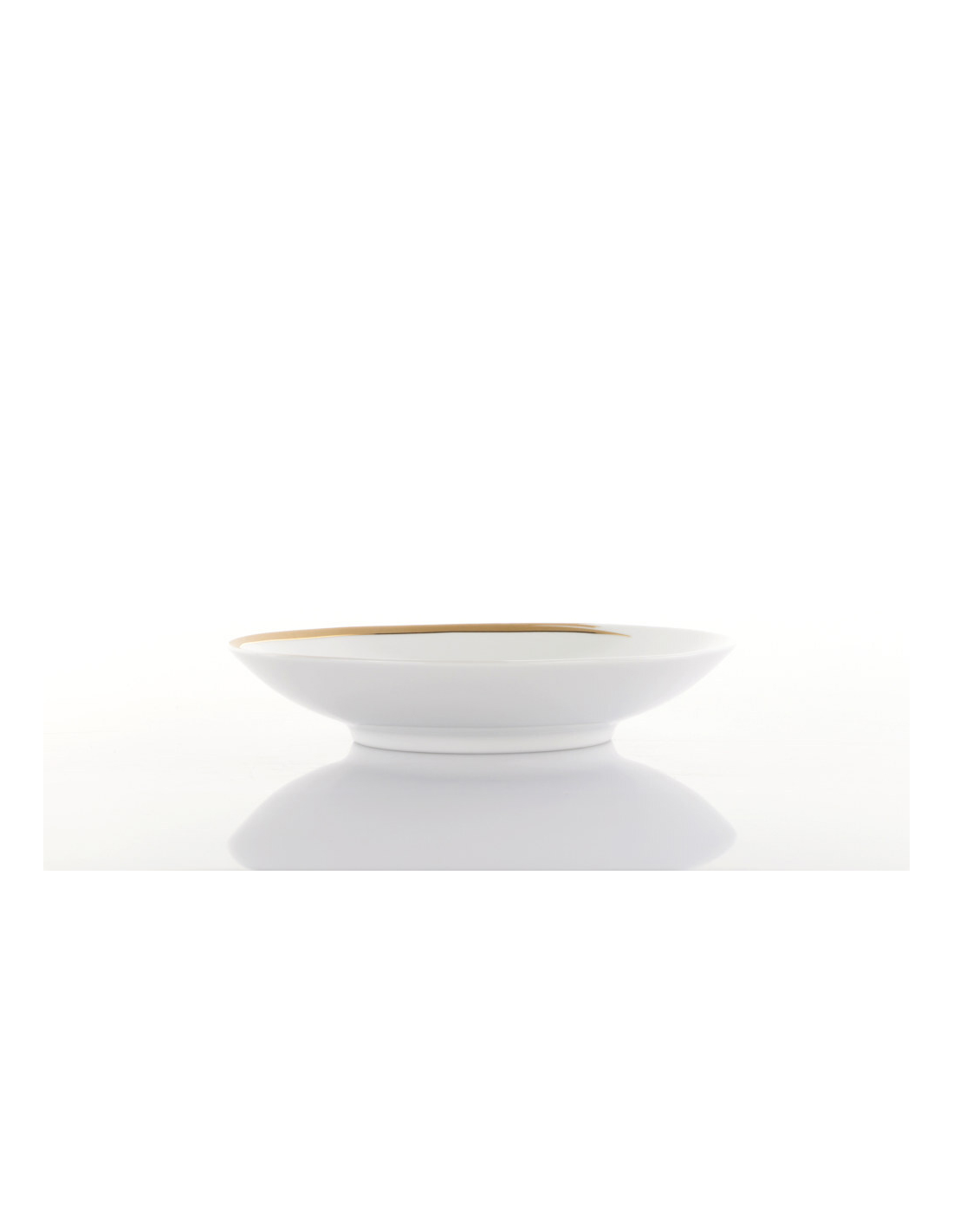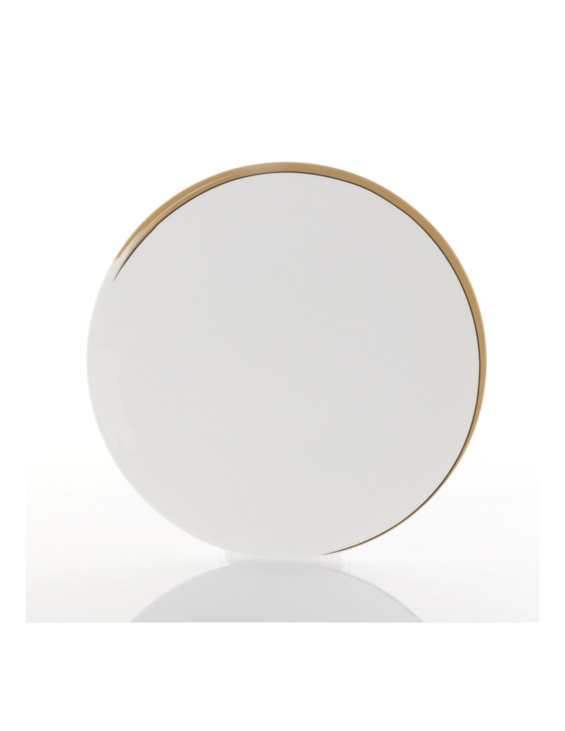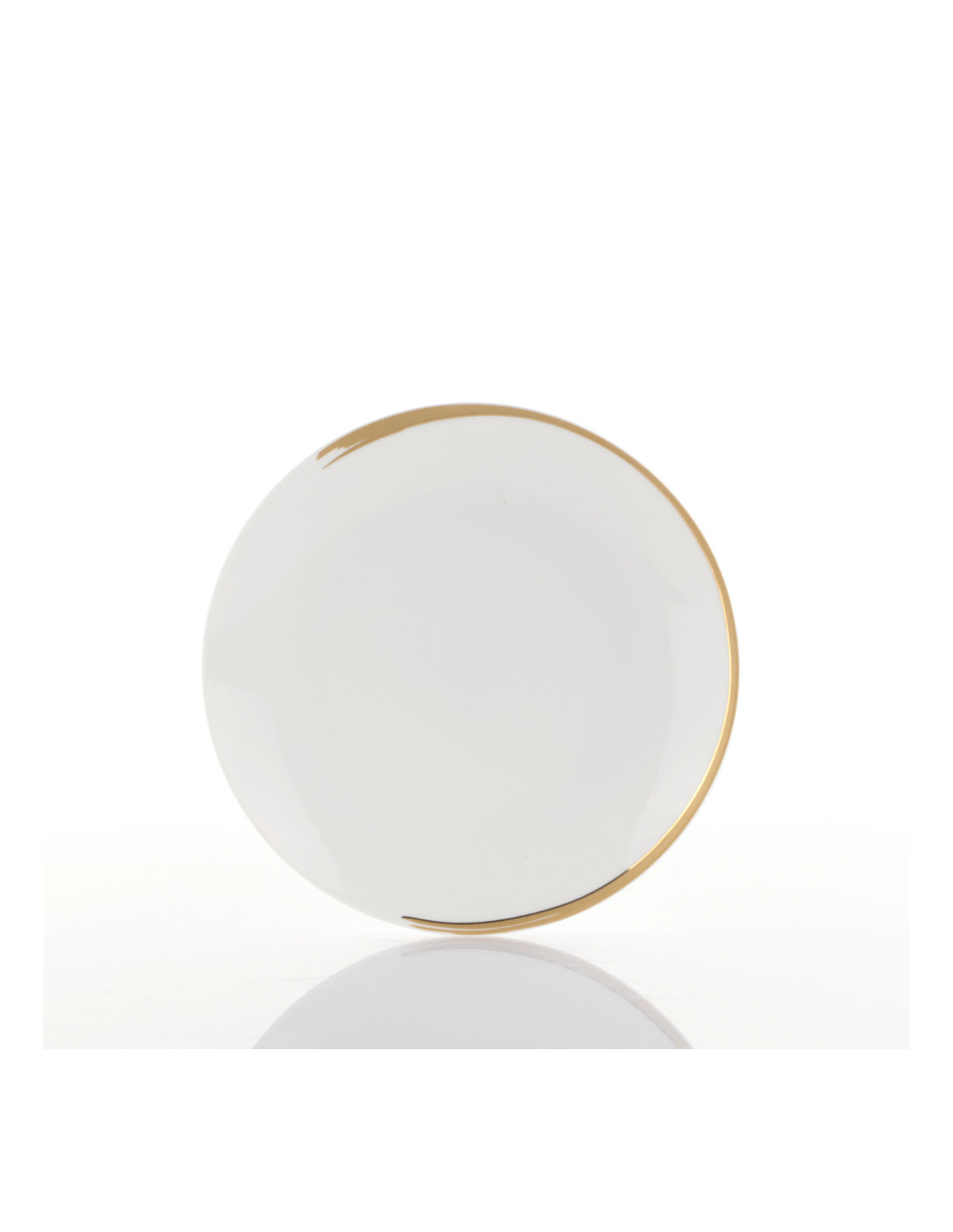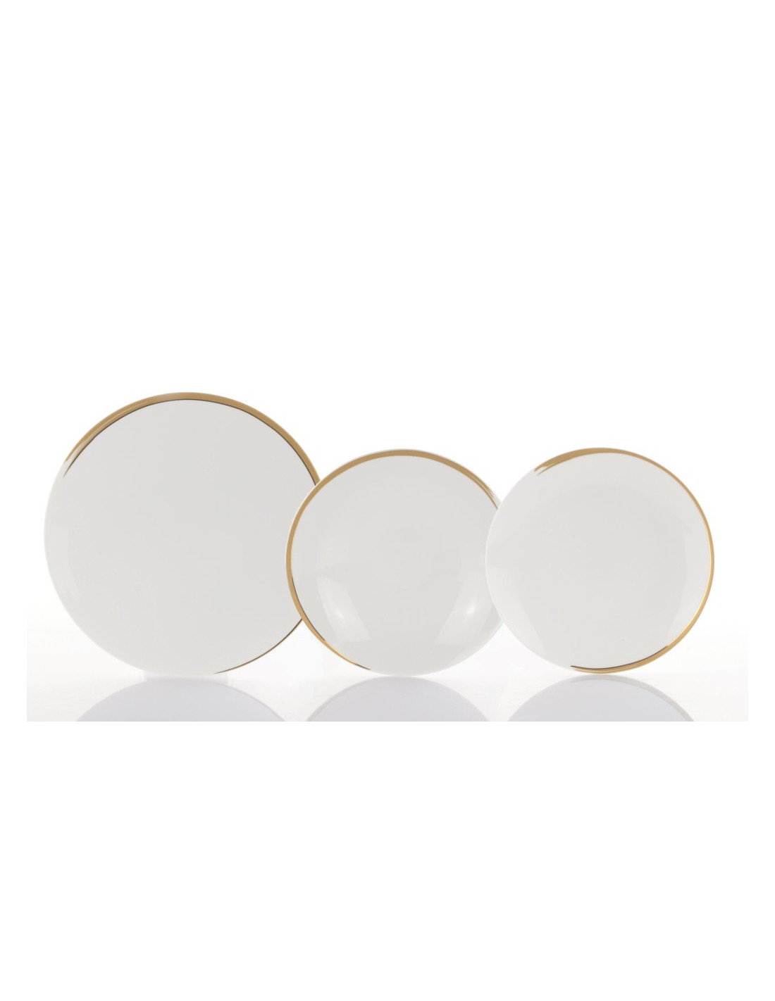 Servizio piatti eleganti in porcellana bianca con bordi decorati da rifiniture in oro.